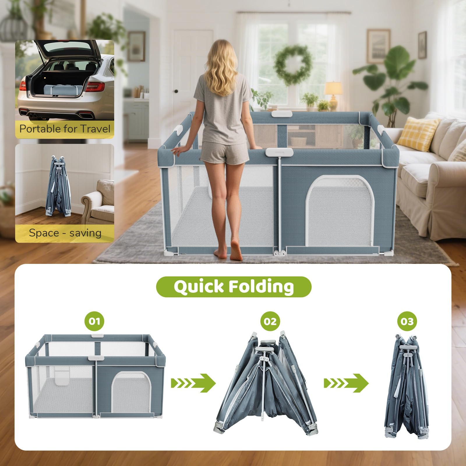 【Outdoor Preferred】As a convenient baby playpen, this eliminates bulky parts, unfolds and retracts like an umbrella at any time, one person can do it independently and quickly, can be put into a storage bag into the trunk of the car and other empty spaces, put it wherever you go, it is ideal for a park outing or a visit to the elders' home. A safe outdoor playpen can be set up in any empty space within 60 seconds.