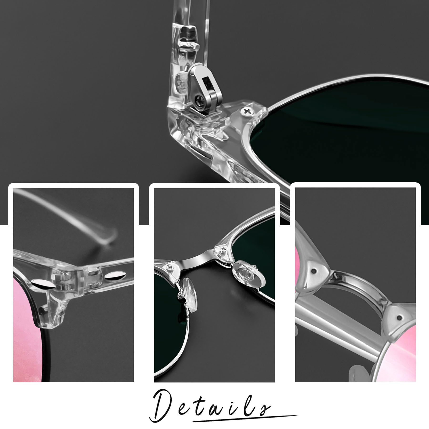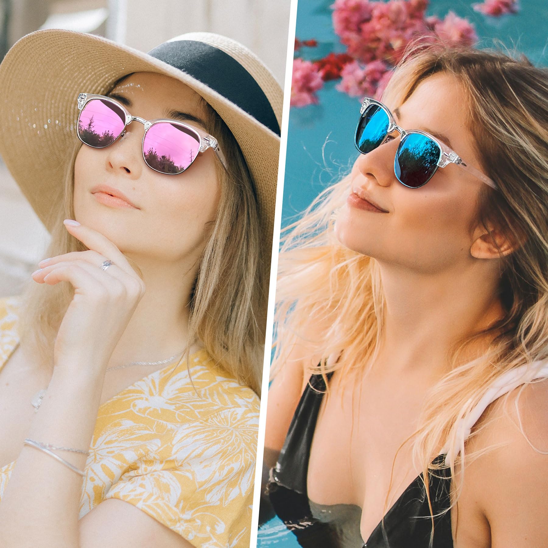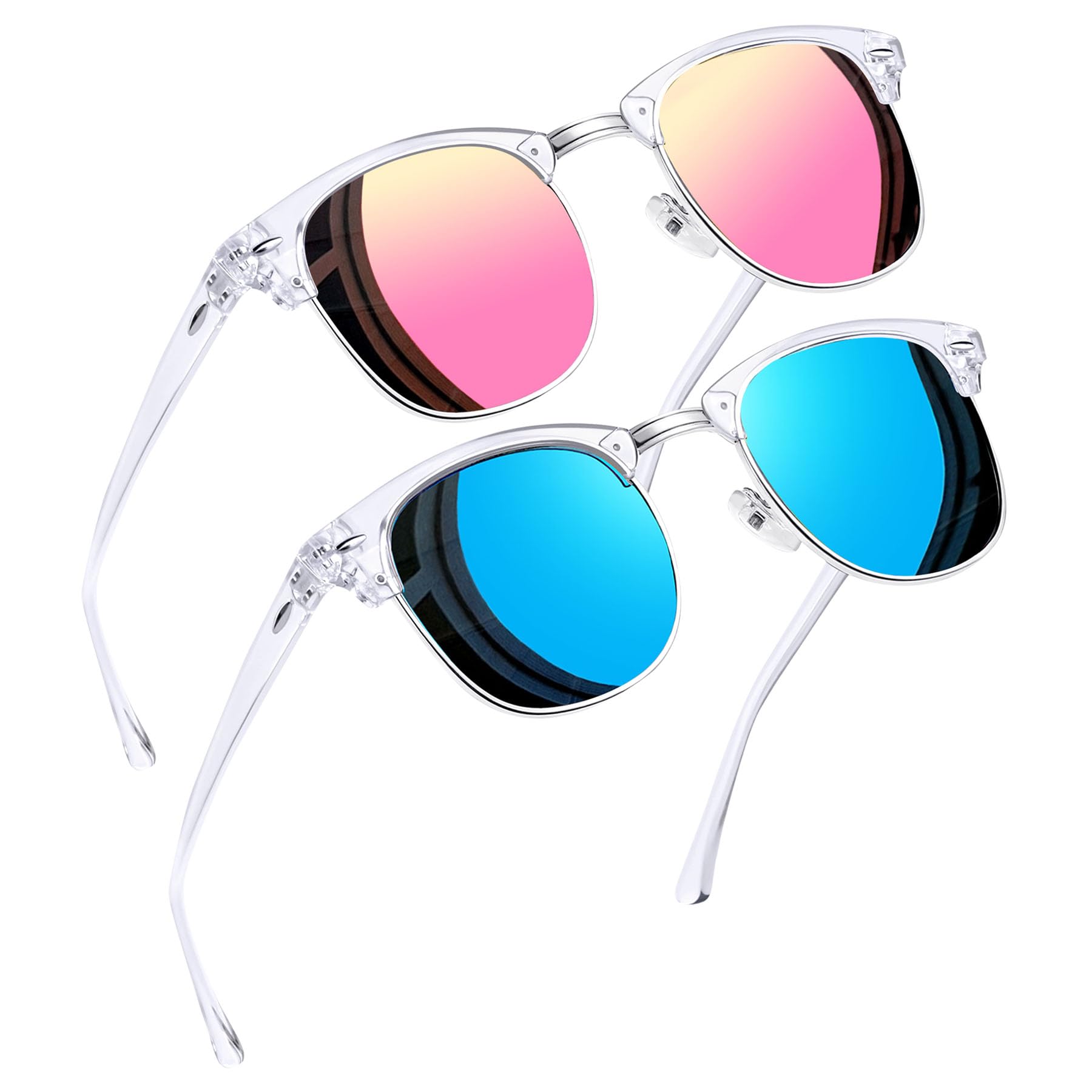 Timeless Browline Style: Club Masters sunglasses date back to the 1950s, were popular in the 1980s, and are still a classic today. Semi rimless sunglasses have a solid plastic browline area, with sturdy wire metal frame, soft silicone nose pads, double-burst metal hinges, and polarized lenses make retro mirror sunglasses perfect for everyday use. 2 pack sunglasses, the mirrored blue sunglasses make you attractive, the pink mirror sunglasses make you cute