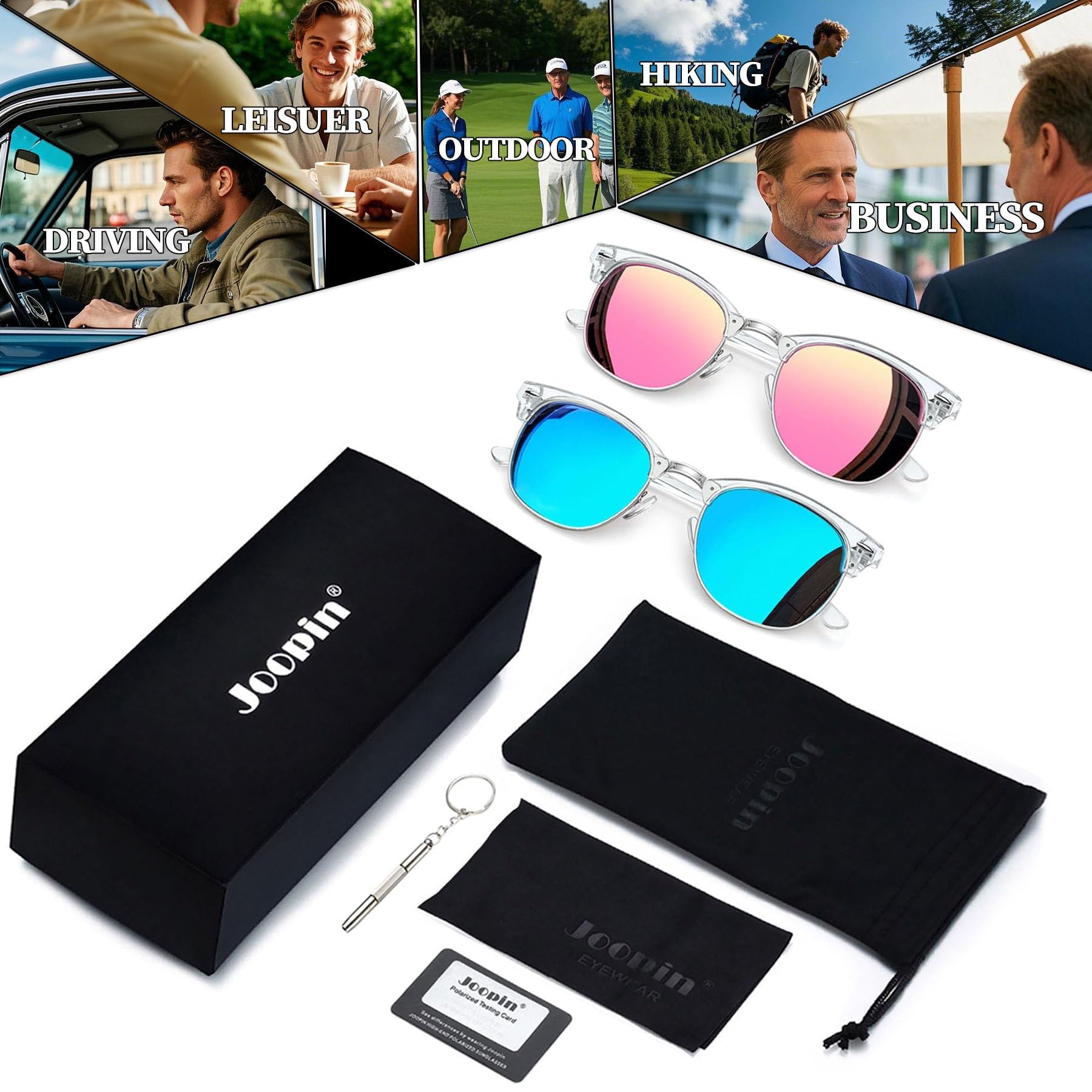 Exquisite Box Packaging: Clear frame blue lens sunglasses x 1/ transparent frame mirrored pink sunglasses x 1 / soft box x 1/ exquisite bag x 1/lens cloth x 1/ screwdriver x 1/ polarized testing card x1. Step out in style with these sunglasses. packaged already, making it a wonderful yet practical festival idea for friends and family! Joopin focuses on fashion womens sunglasses and mens sunglasses. Click and get your quality and cheap sunglasses now