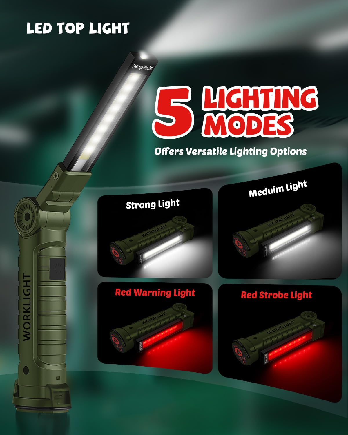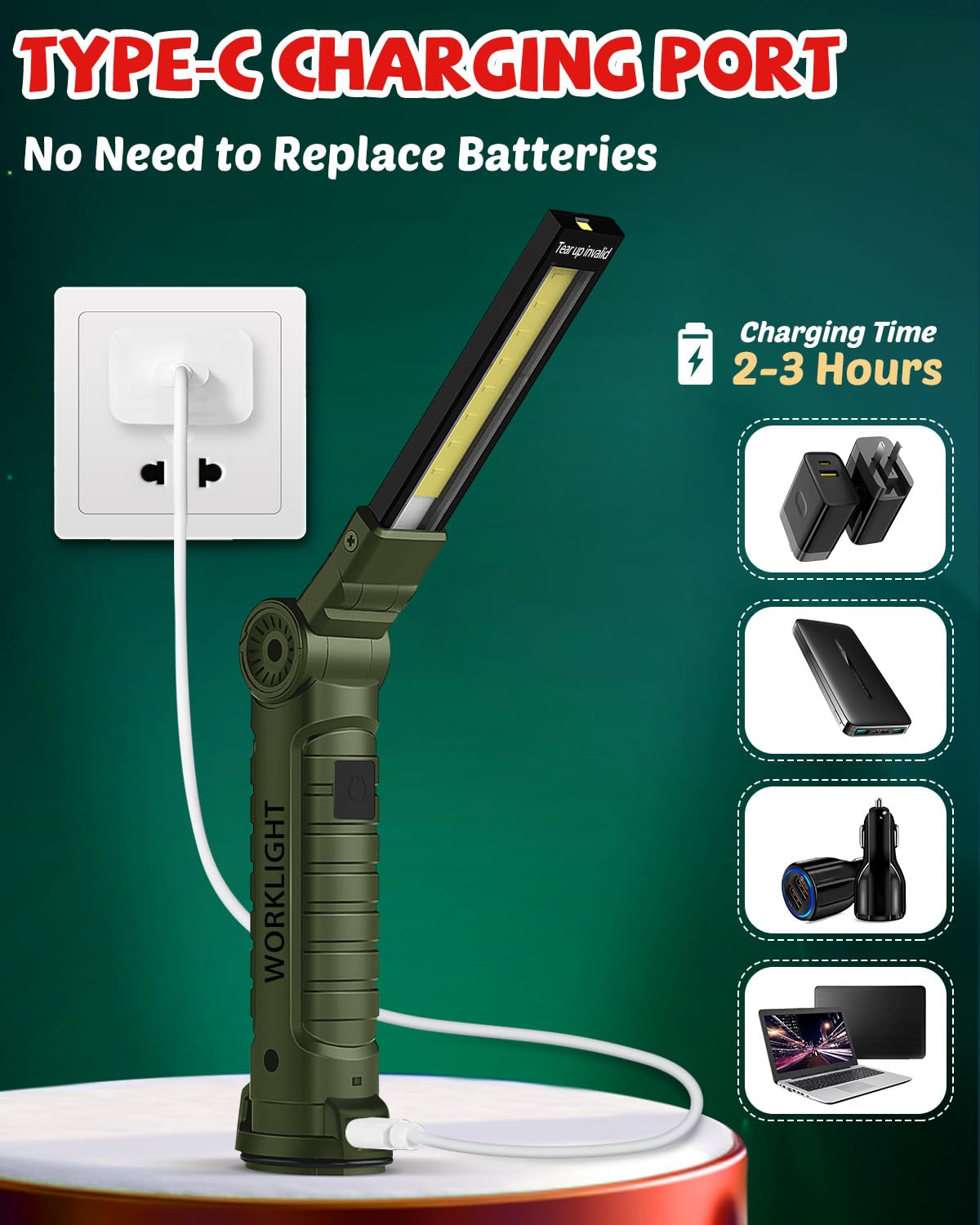Sturdy Material and Portable: This led work light is made of hard rubber, anti-sweat and anti-slip, the head is aluminum which dissipates the heat effectively, prolong the life of the lamp. Thanks to the foldable design, the lamp is easy to carry, and save storage space
