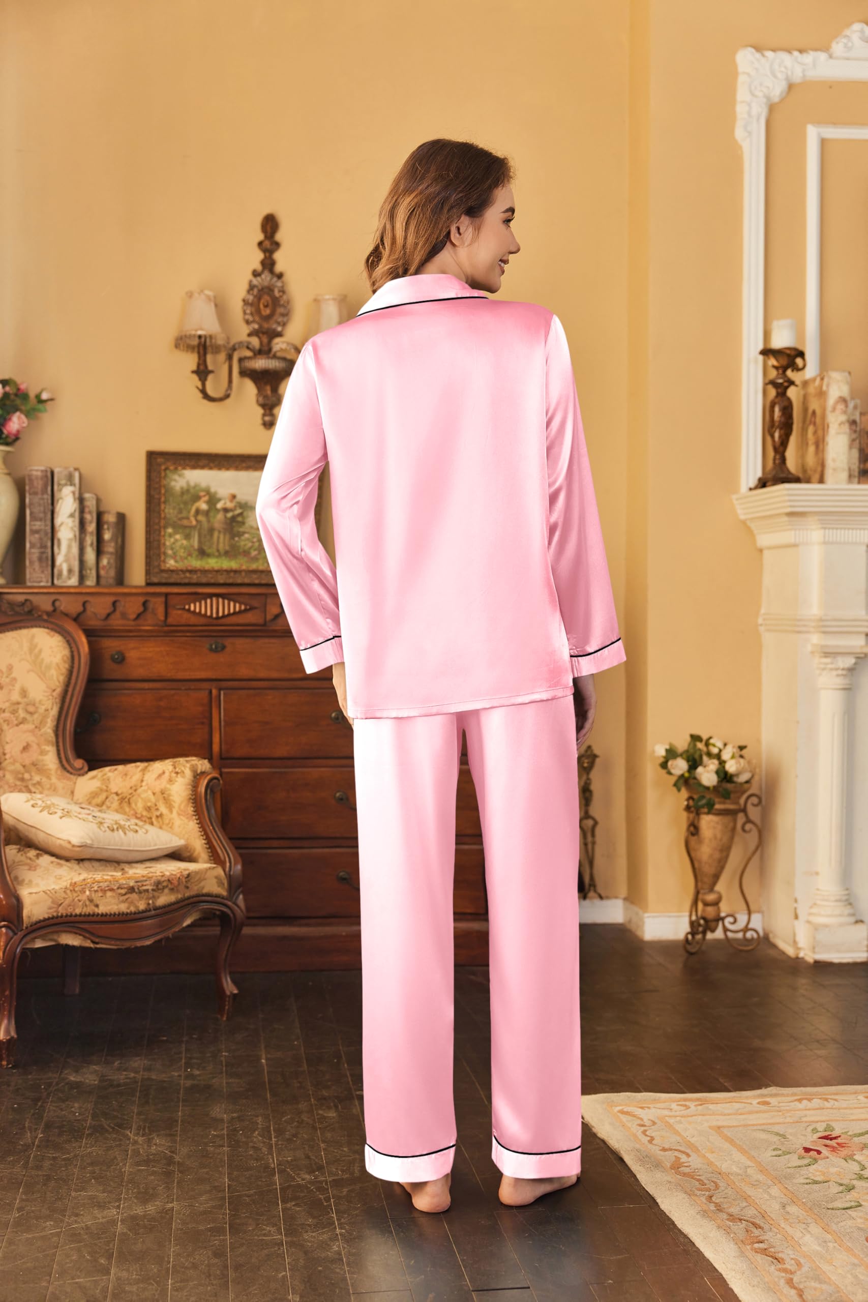 MATERIAL:The pajamas set is made of premium satin fabric,skin friendly,breathable,lightweight,keeps easeful sleeping at night
