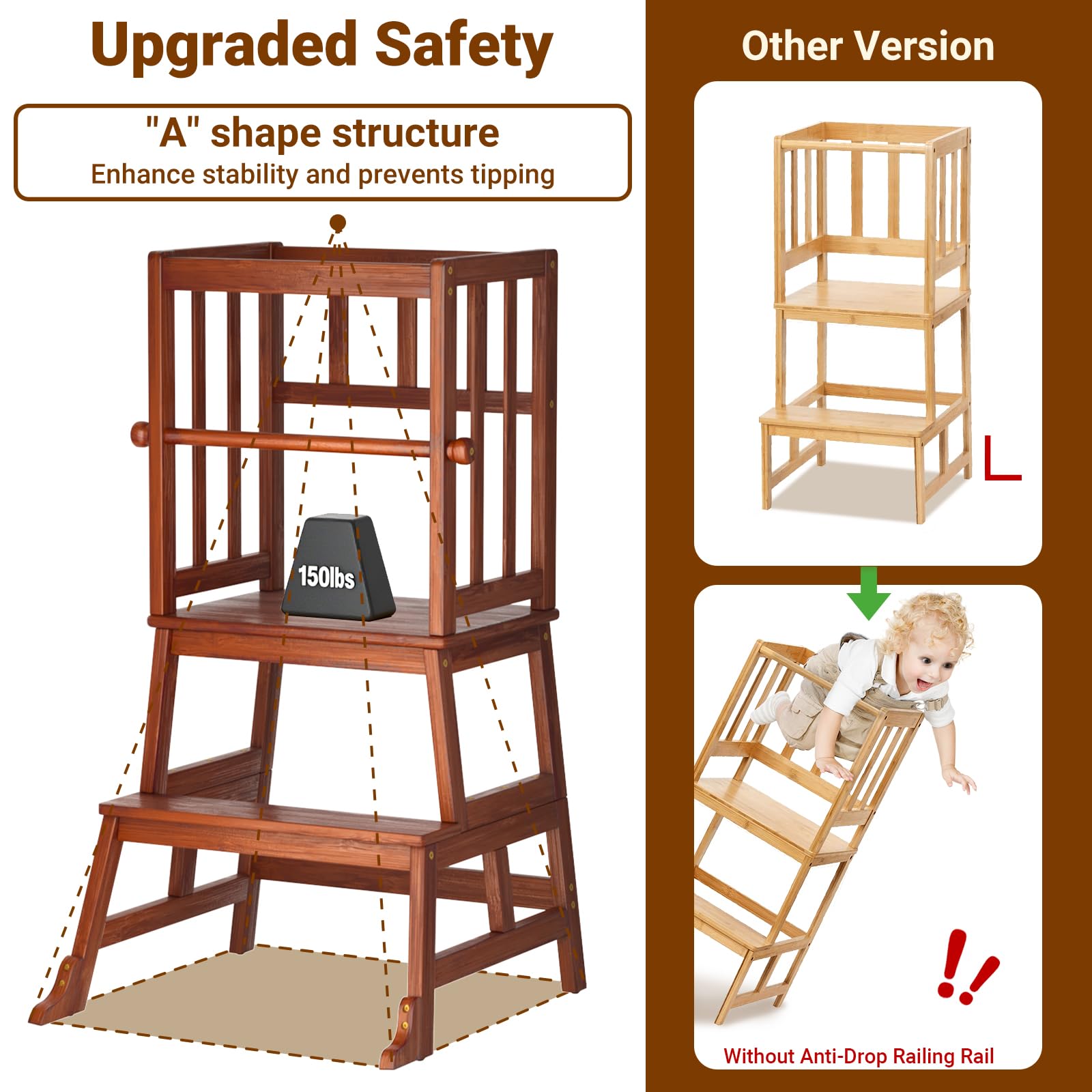 "A" Structure is More Stable: Designed and tested to exceed child safety standards. "A" Shape structure reduces risk of toppling. Non-slip feet. The four-sided railings provide support with an additional removable anti-fall bar as needed