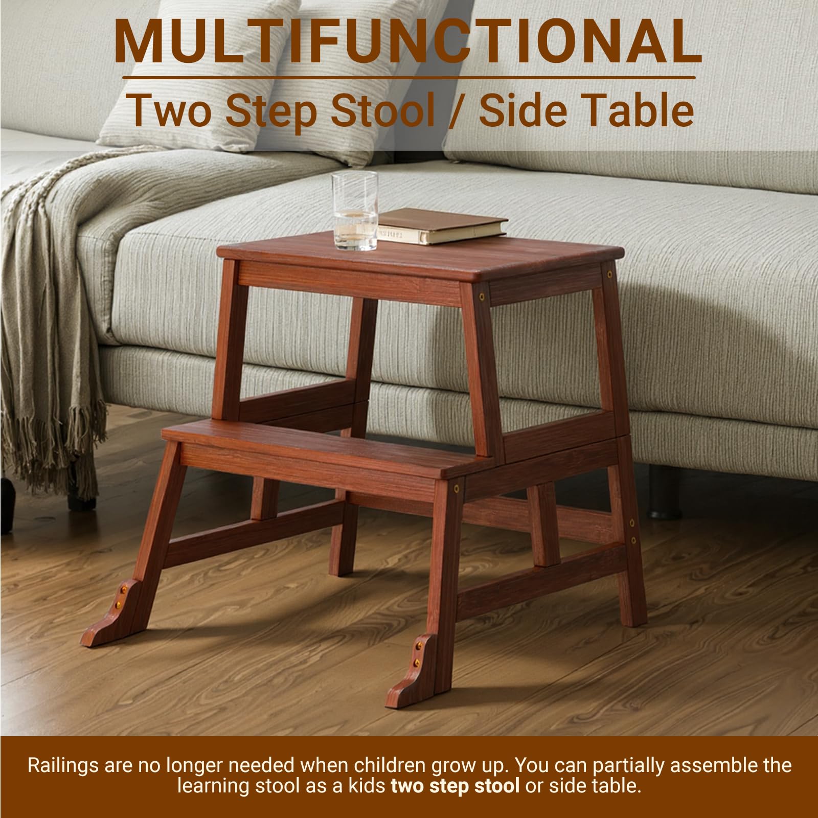 Strong and Versatile: Hand-selected sustainable material is sturdy and lighter than other woods, and has great natural coloring. It also functions as a little table/desk, and as steps that can take the weight of adults when needed