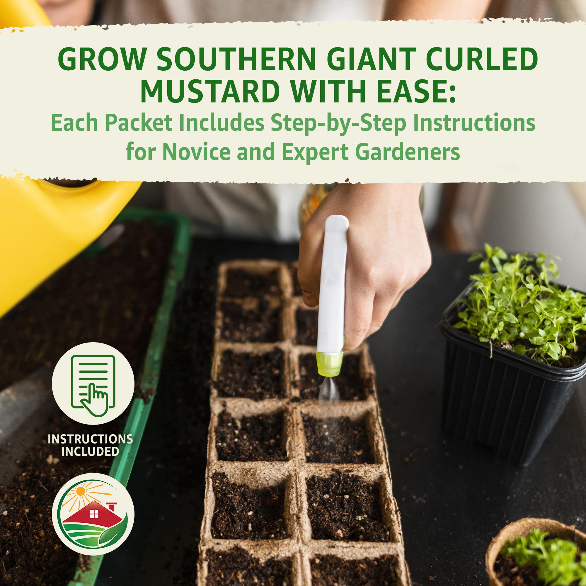 VERSATILE GROWING OPTIONS FOR YEAR-ROUND HARVEST: Plant Southern Giant Curled mustard greens any season! Start seeds outdoors in early spring or plant as fall seeds for a hearty autumn crop. In mild climates, sow outdoors in winter, as these greens tolerate light frost. Grow indoors year-round in containers or as microgreens for a continuous supply of fresh, tender leaves.