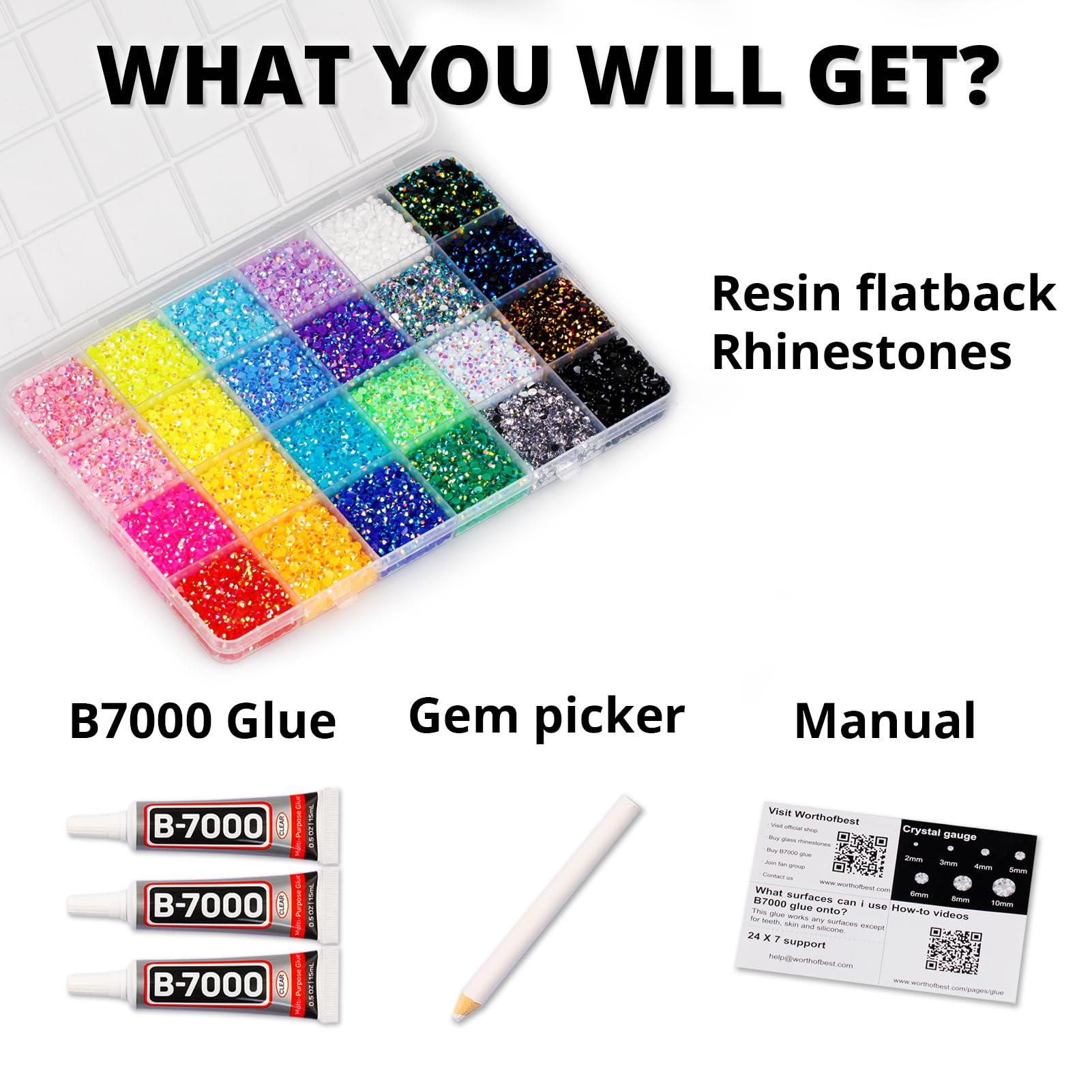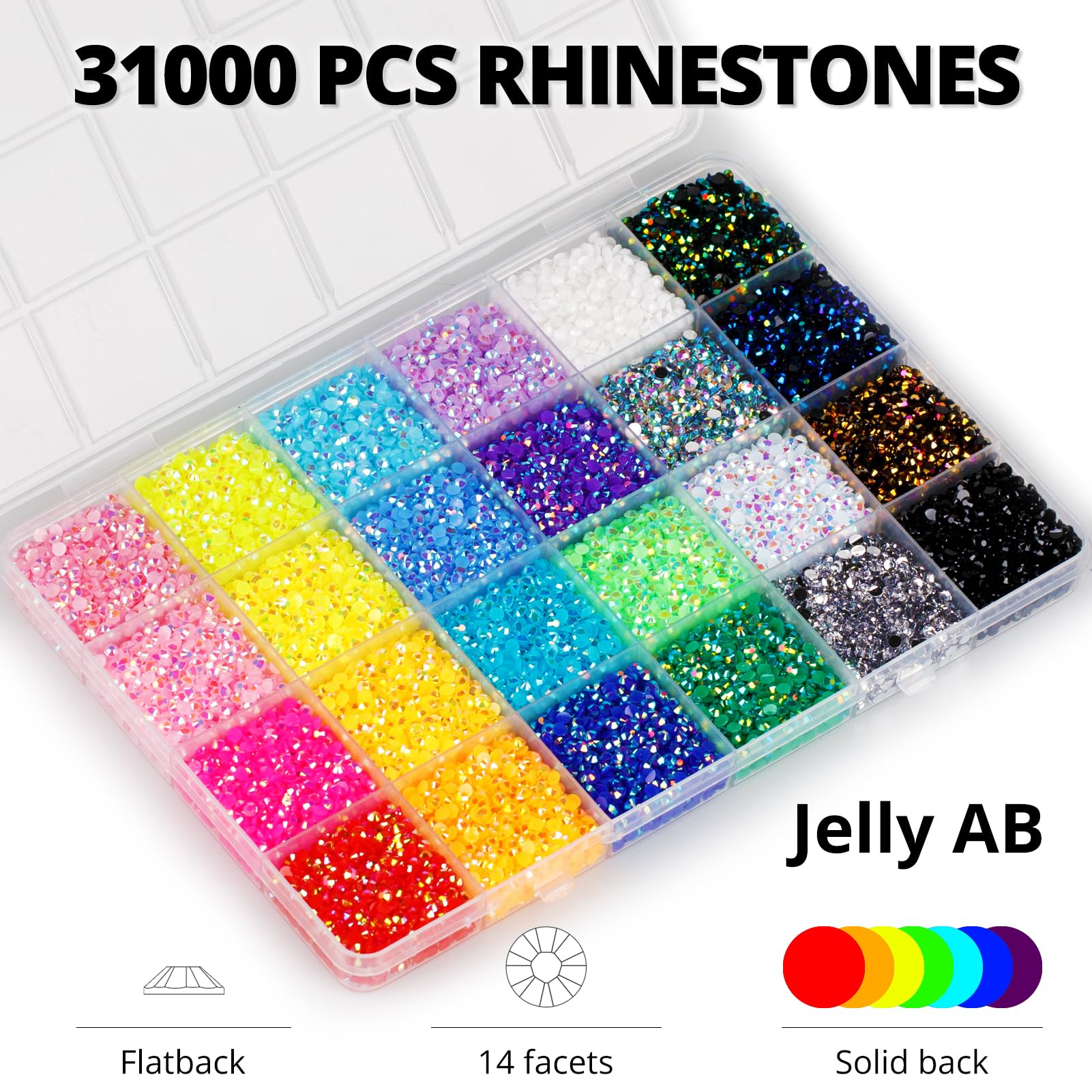 Package Content with Tool (pickup pen and manual) -- The bedazzler kit Package includes 1 jelly ab rinestones set with 24 grids, mixed various colors, approx. 31000 pcs of 3mm bling-out resin rhinestones