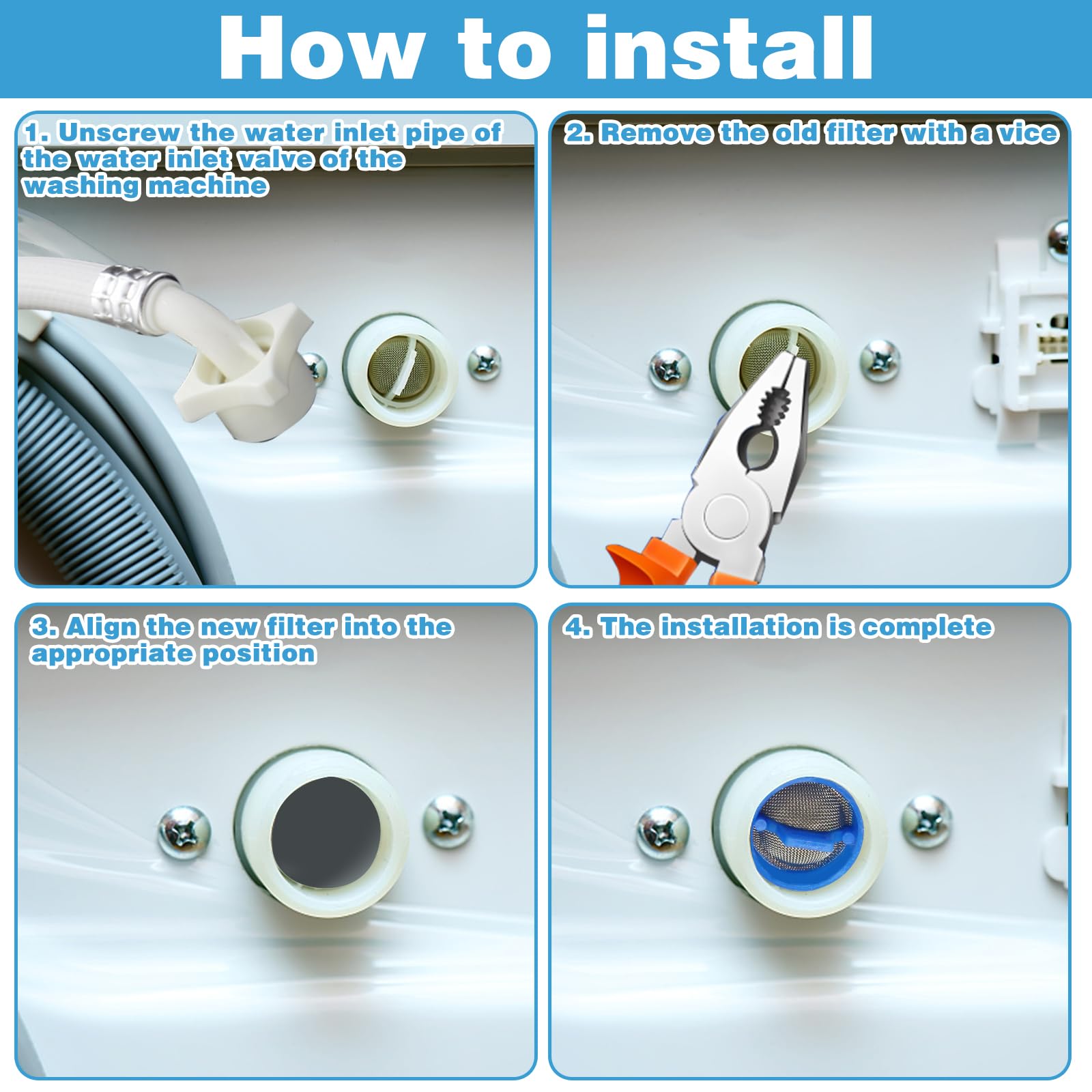 【Easy to use】This hose washer filter with screen is easy to disassemble and install, first unscrew the water inlet pipe at the water inlet valve of the washing machine, then use a vise to pull out the old filter and finally put the new washing machine filter, you can also clean it with a small brush for a cleaner wash every time.