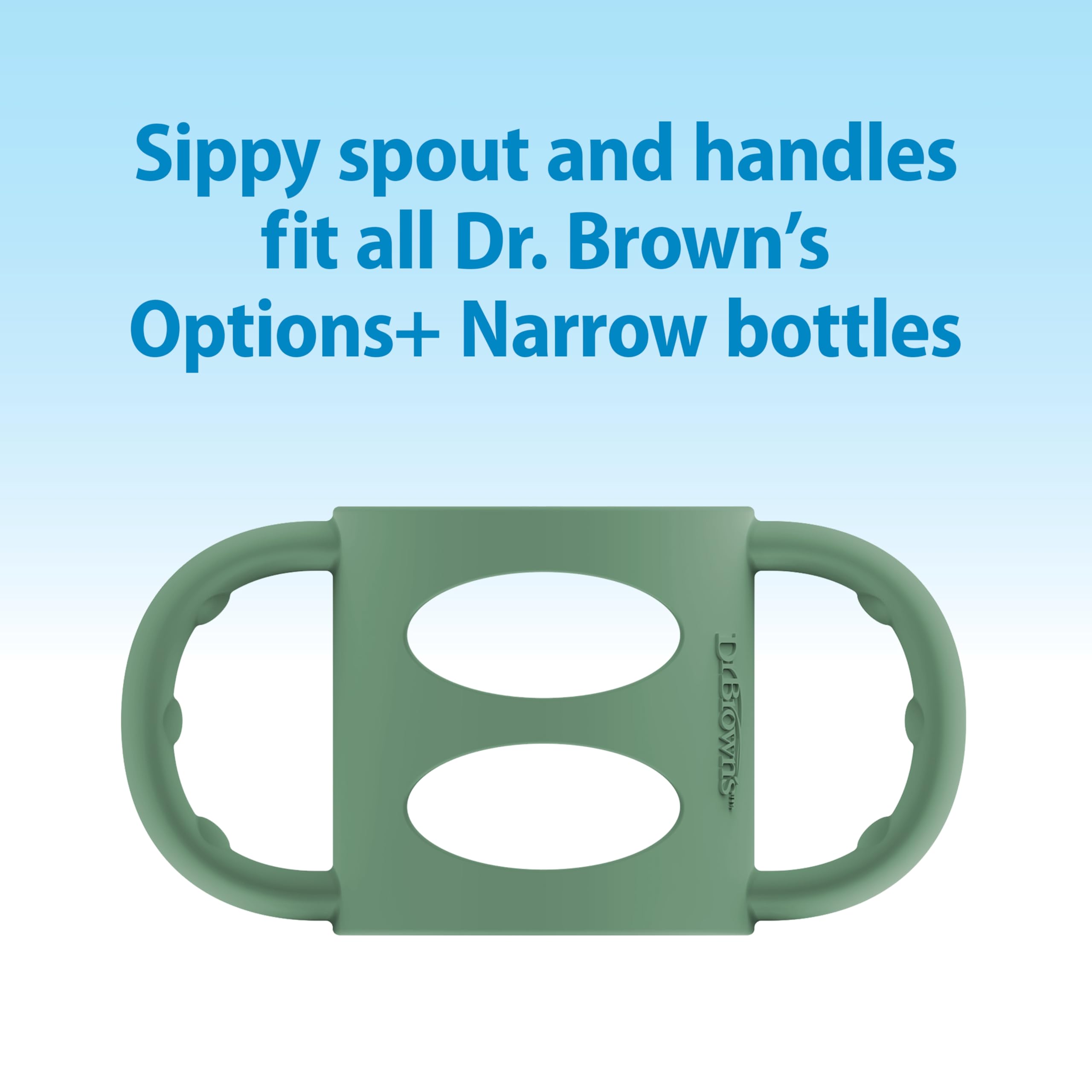 Dr. Brown's Milestones Narrow Sippy Spout Bottle is the easy way to help baby develop new drinking skills! Introducing a sippy spout has never been simpler. The soft silicone sippy spout is used in place of the nipple on the Dr. Brown's Narrow Bottle that's already familiar to baby. Easy grip 100% silicone handles are removable and fit most narrow bottles and sippy cups, while the snap-on cap keeps the spout clean when on-the-go. The soft sippy spout fits any Dr. Brown's Options+ Narrow Bottle after the internal vent is removed. All parts are dishwasher (top rack only) and sterilizer safe. BPA-free. 6m+.