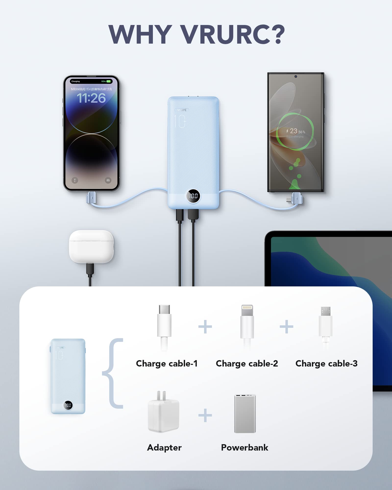 [Portable Charger With Built-in Cables and AC Wall Plug] This portable charger is not only has a built-in Micro cable, USB C cable, and other charging cable for iPhone, but also is equipped with a USB port,and USB C port. Also, Portable phone charger is built-in wall plug that charges the power bank itself directly from the wall outlet.