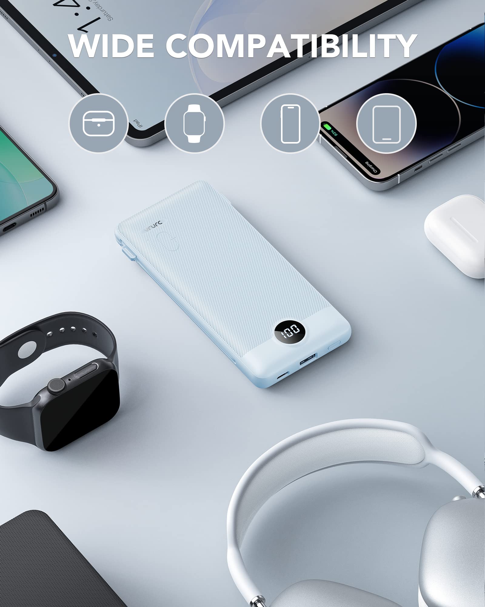 [Wide Compatibility] Using the built-in charging cables to charge, the portable battery charger is compatible with iPhone, Android devices, and USB-C most mobile phones and smart devices etc. This battery pack can meet most of the charging needs of daily life.