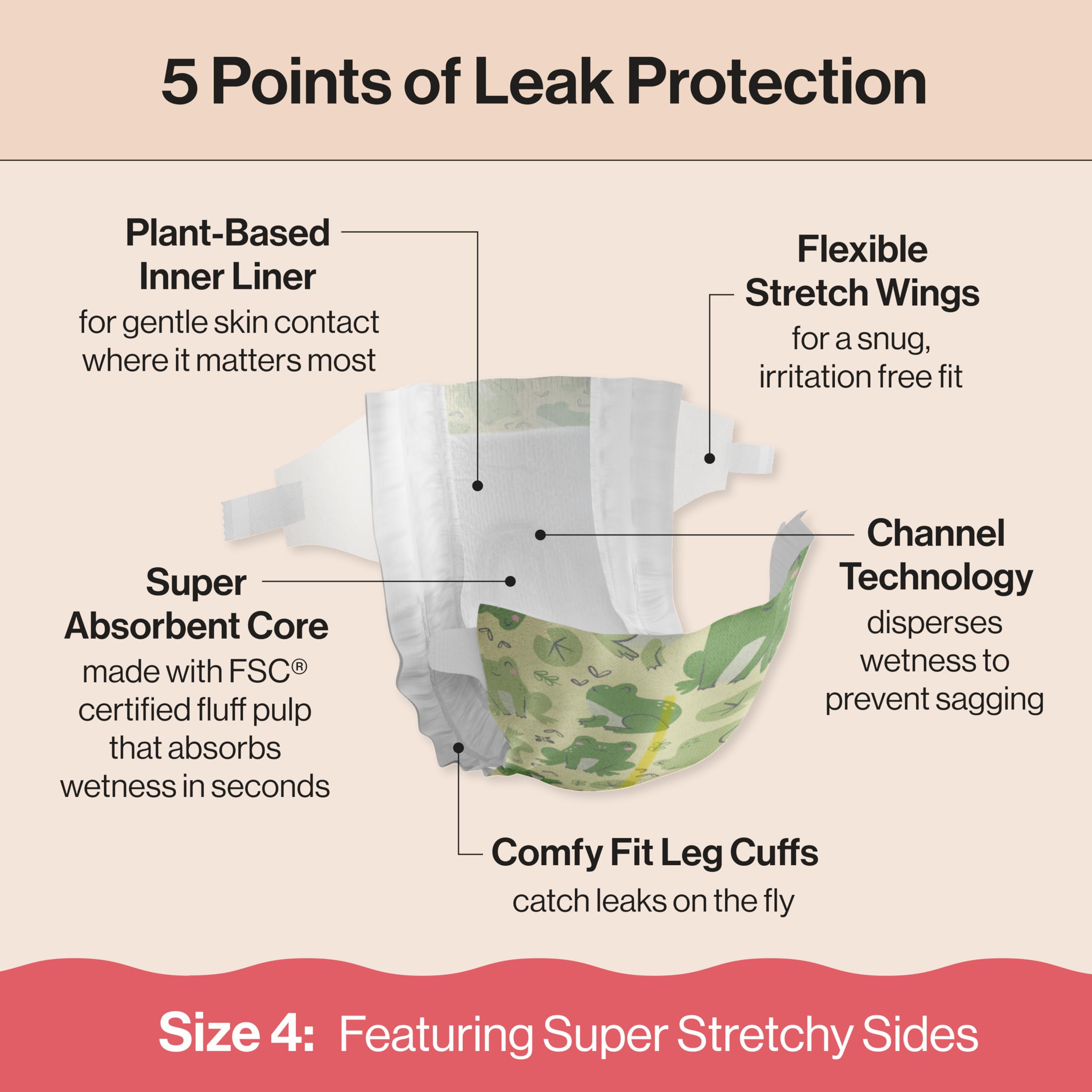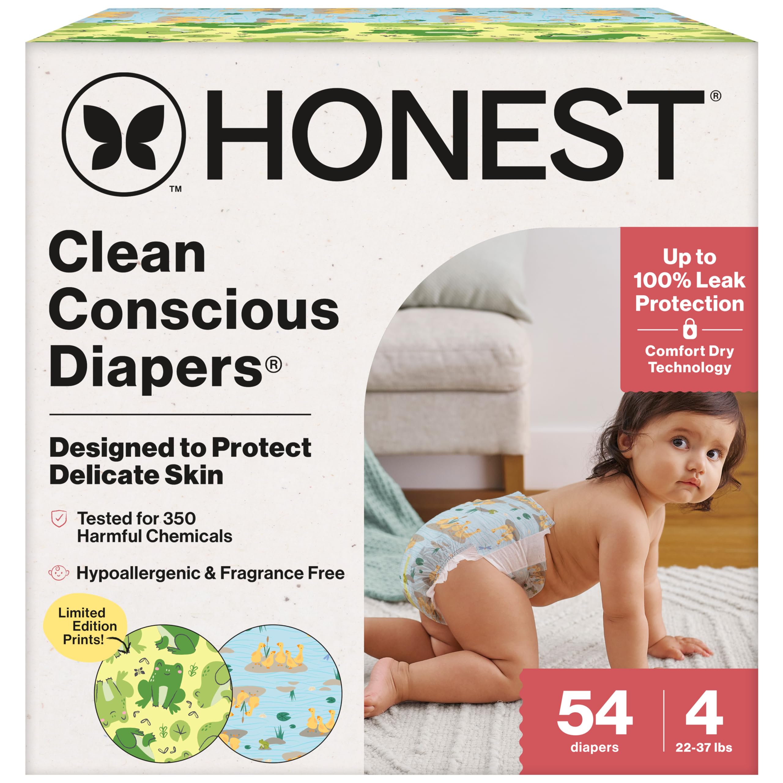 Designed to protect delicate skin, our Clean Conscious Diapers® keep baby comfortable and dry through all the wiggles + wobbles! They deliver up to 100% leak protection with Comfort Dry Technology, a super absorbent core and hypoallergenic, plant-based inner liner for gentle skin contact. Our softest diaper yet features comfy leg cuffs and flexible stretchy wings for a cozy snug, irritation-free fit. And because safety is our top priority, they're made without elemental chlorine, parabens, fragrance and natural rubber latex, and OEKO-TEX® STANDARD 100 certified –3rd party tested for 350 harmful chemicals. For cuteness overload, each diaper features a super cute print and wetness indicator so you know when it's time for a fresh one. How to Use: Lie your baby down on their back, on a safe, flat surface. Lift them gently to place the diaper under them. Bring the diaper front over and up to your baby’s stomach, and use the adhesive diaper tabs to fasten securely. To minimize leaks, make sure the diaper’s leg cuffs are pulled out, rather than tucked in. Materials: Absorbent Bio-Core [Elemental Chlorine Free (ECF) Wood Pulp From Responsibly Managed Forests and other controlled sources], Sodium Polyacrylate containing plant derived odor Inhibitors including Citrus Extract & Liquid Chlorophyll, Outer Layer (Polypropylene), Inner Layer (Plant-Based PLA & Polyethylene), Leg/Waist System (Polymer Spandex & Polypropylene), Polyolefin Adhesives in the Seams & Joints, Wetness Indicator, Super-Cute Design on Backsheet (Inks) Caution: To avoid risk of suffocation, keep this packaging away from babies and children. Choking may result from anything babies put in their mouths. To avoid risk of choking, do not allow baby to tear the diaper. Like any piece of clothing, diapers are flammable.