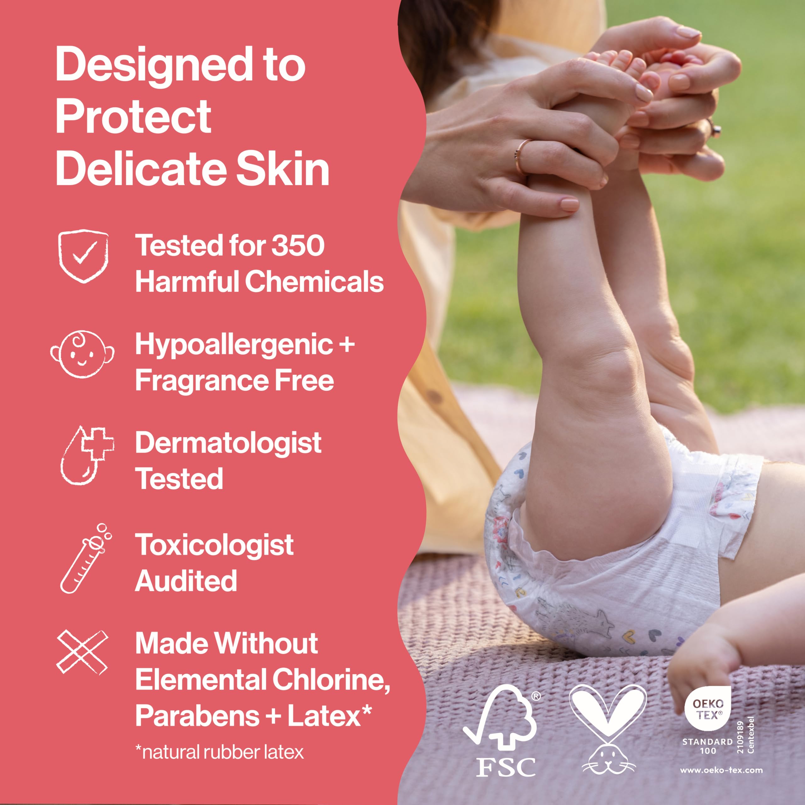 DESIGNED FOR DELICATE SKIN: Hypoallergenic, fragrance free diapers with a plant-based inner liner for gentle skin contact