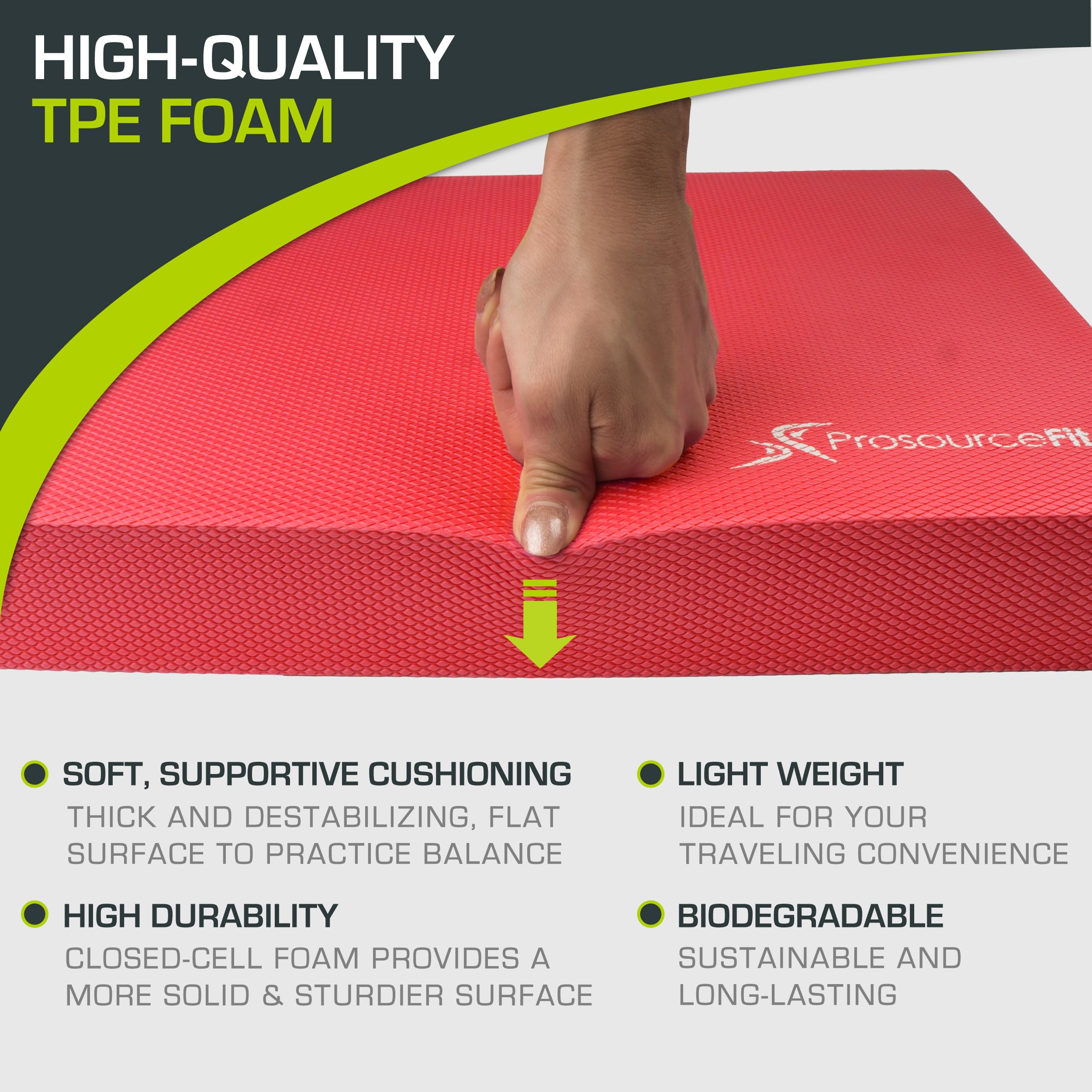 Make any exercise more effective with the ProsourceFit Exercise Balance Pad. The extra-large destabilized surface helps improve balance and body awareness while strengthening knees, ankles and feet. Stand, kneel or sit on the pad to engage core muscles, creating a stronger core and more stable body. The non-slip fitness pad is textured and can be used for simple or advanced exercises. Ideal for those new to fitness, going through physical therapy, or mature adults to enhance balance, it can also be used as a meditation pillow or be the perfect addition to make workouts more challenging during single-leg squats, single-leg deadlifts and reverse lunges. The cushioned surface also strengthens joints and ankle stability, perfect for those recovering from feet or ankle injuries, as well as improving mobility and preventing future injuries. The non-toxic TPE material is water and moisture resistant, making it easy to clean while preventing odor and bacteria build-up from sweat. The 18.75”L x 15”W x 2.25”H extra-large balance mat provides a more solid destabilization surface, offering a greater variety of exercises and variations to train core strength for injury prevention, enhance athletic performance and stability training.