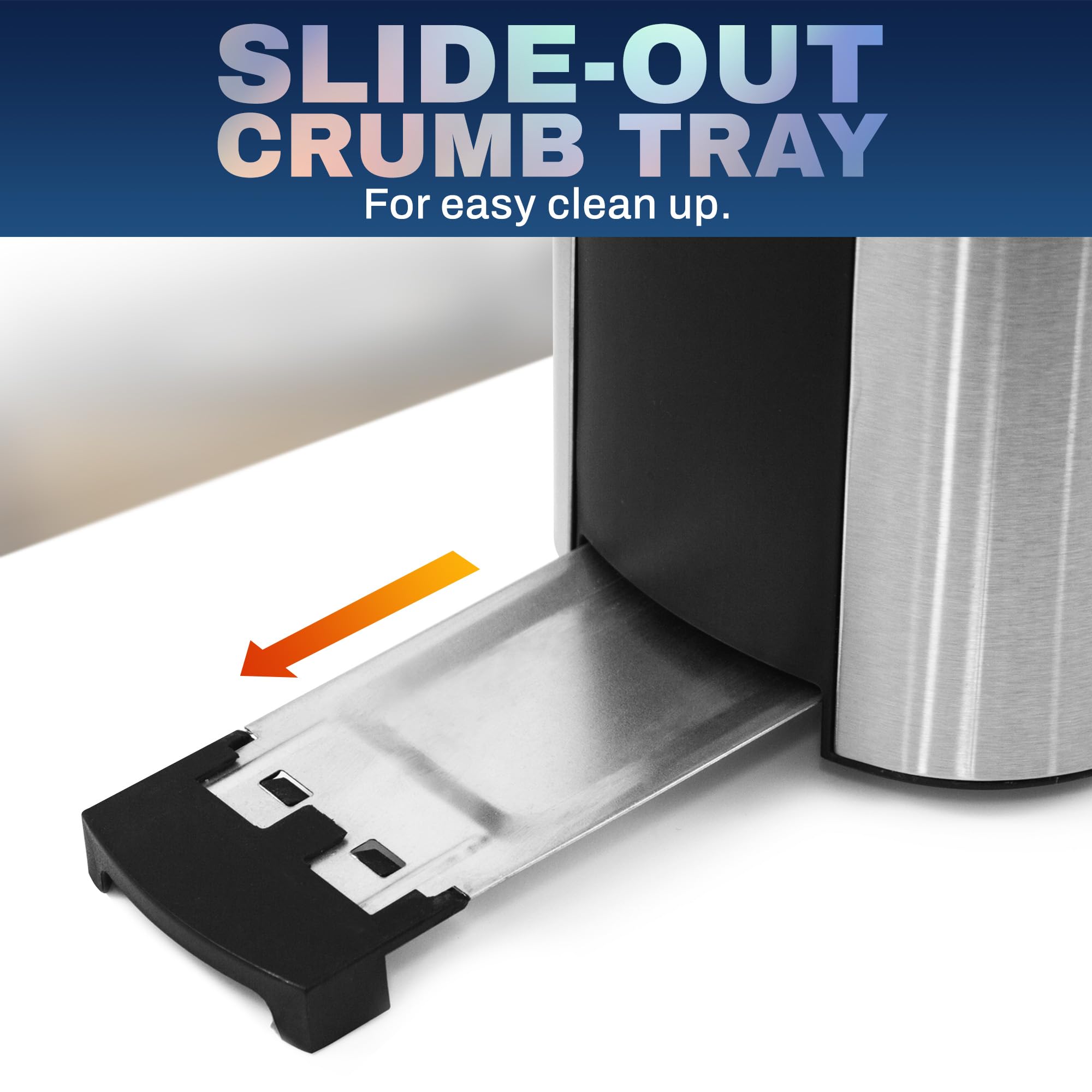 SLIDE OUT CRUMB TRAY easily releases from the bottom of the toaster for quick and easy cleanup of crumbs and debris.