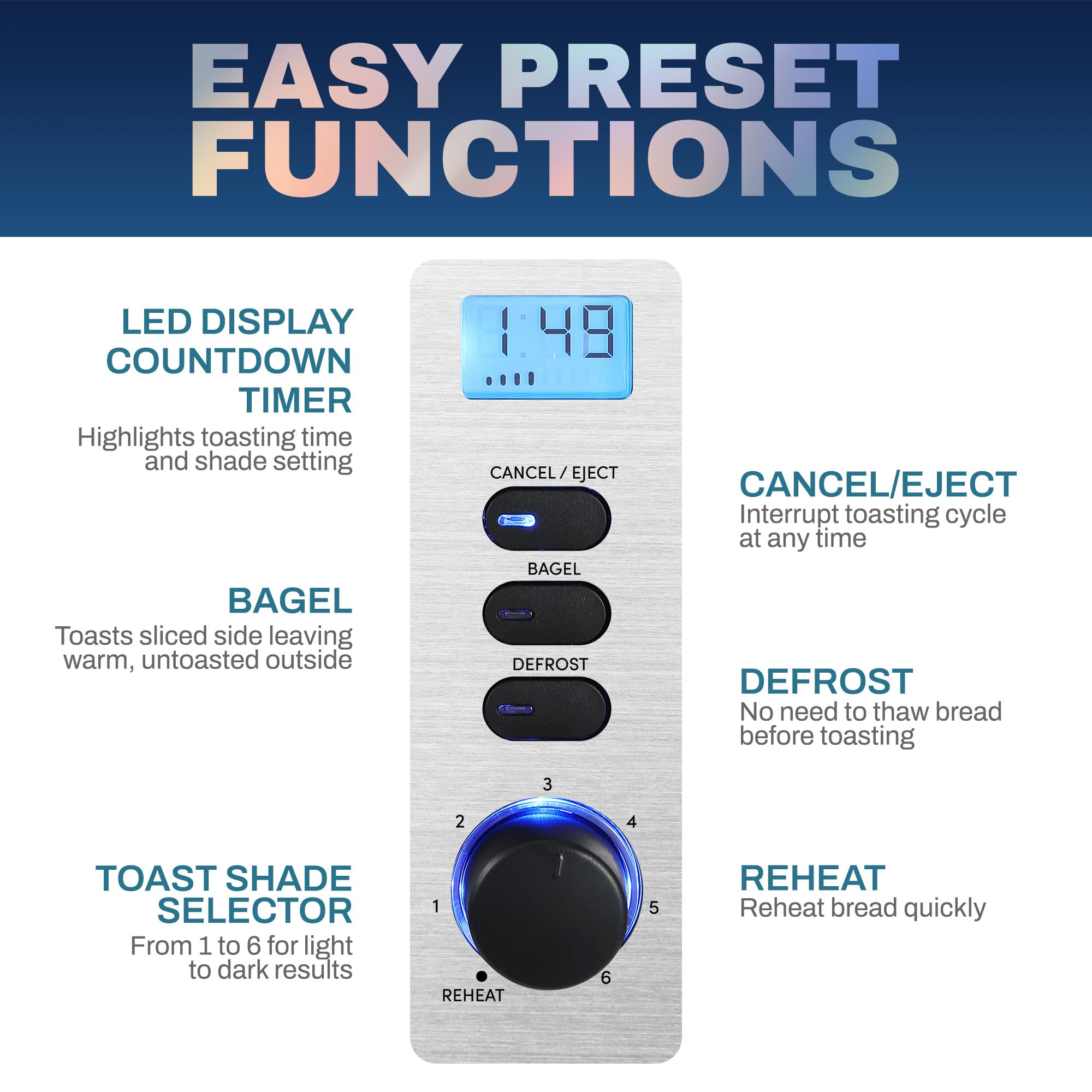 DEFROST & BAGEL FUNCTION allows you to easily defrost and toast breads quickly and the Bagel will conveniently toast only one side of sliced bagels.