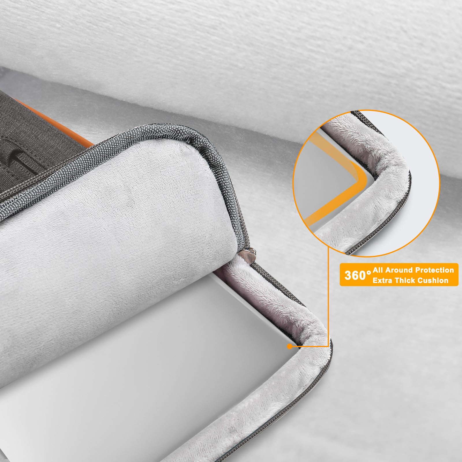 The Laptop Sleeve Case with 360 Degree Protection. 360 degree all around protective reinforced interior edge protect your laptop from any accidental dropping. Features foam padding layer and fluffy fleece fabric lining for bump and shock absorption and protection of your computer from accidental scratches. Side opening double zippers on the bag glide smoothly and allows convenient access to your laptop computer