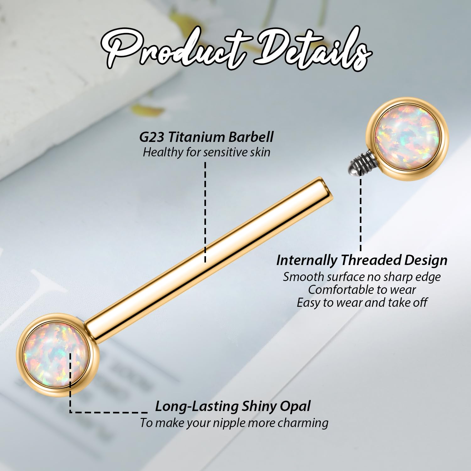Attractive Style: The nipple ring with shiny opal on both side, internally threaded design, make your nipple piercing more attractive