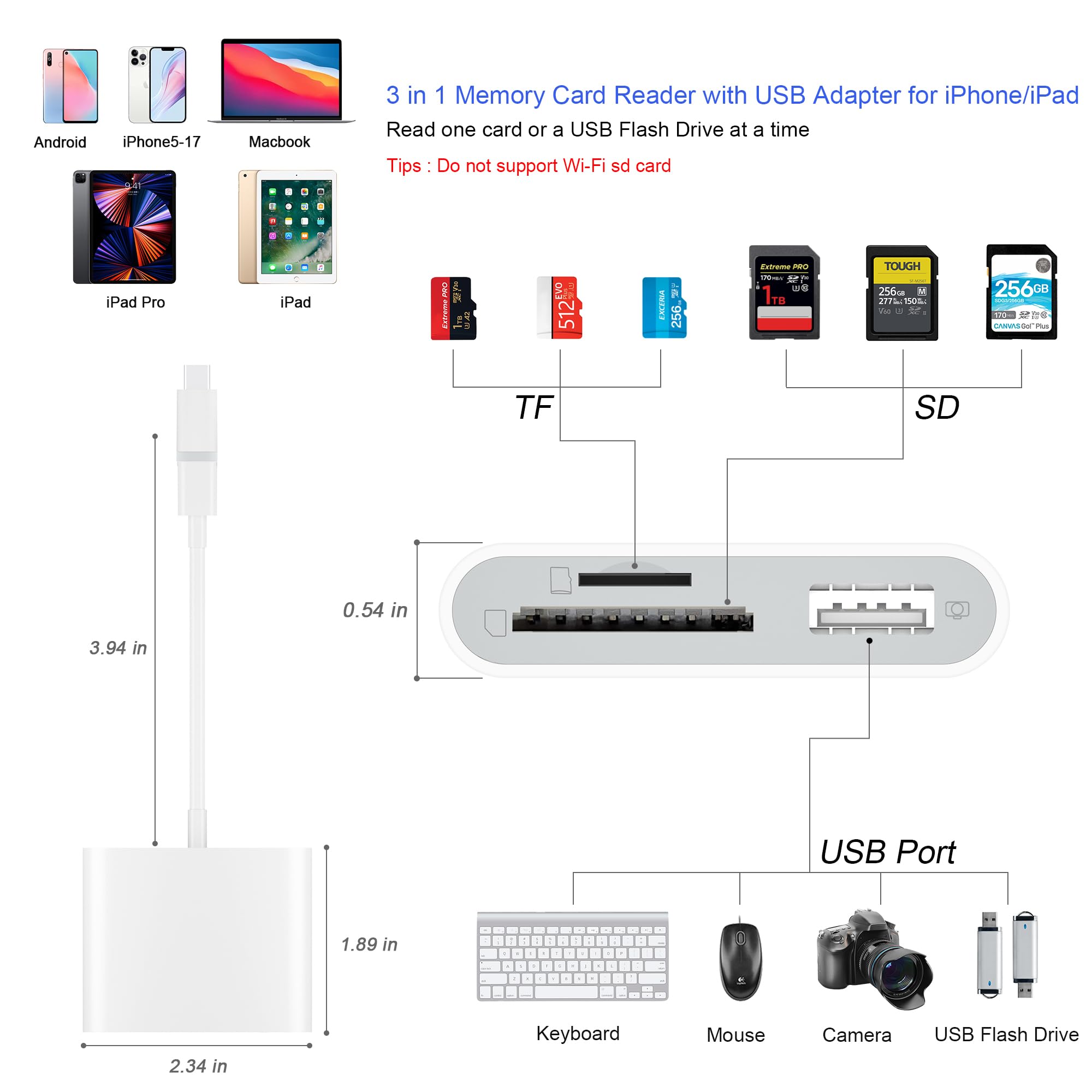 [Two-way Transfer]: Two-way transfer suitable for iOS 13 -18 device. Import data from SD/TF card to iPhone/iPad, or export the file from iPhone/iPad to SD/TF card. Include Movies, Music, Word, Power point, Excel, PDF, etc.