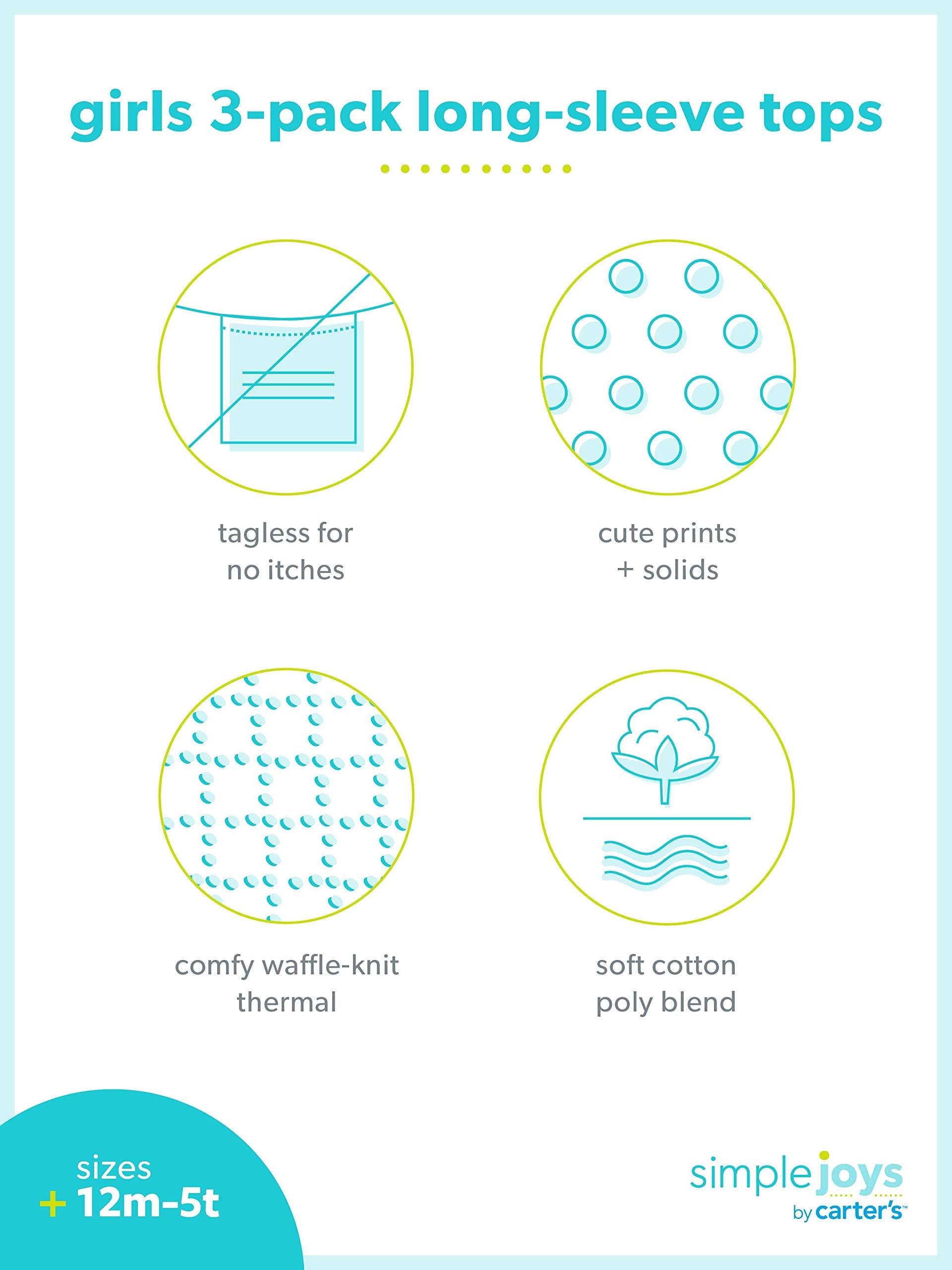 Description Elevate your little one's wardrobe with this 3-pack of long sleeve tops from Simple Joys by Carter's. Designed for comfort and style, each top features thoughtful details like playful prints, vibrant colors, and subtle ruffle accents that add a touch of flair. Perfect for layering or wearing solo, these versatile pieces are an essential addition to your child's everyday outfits. Offering both style and value, this set ensures your child is dressed in both comfort and fun, all season long.