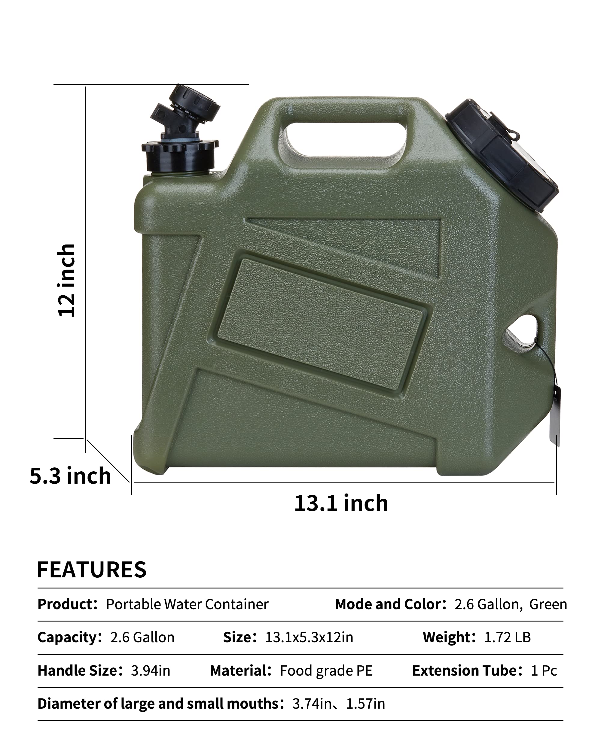 Large Capacity: 2.6 gallon water container can store water for long periods without leakage.