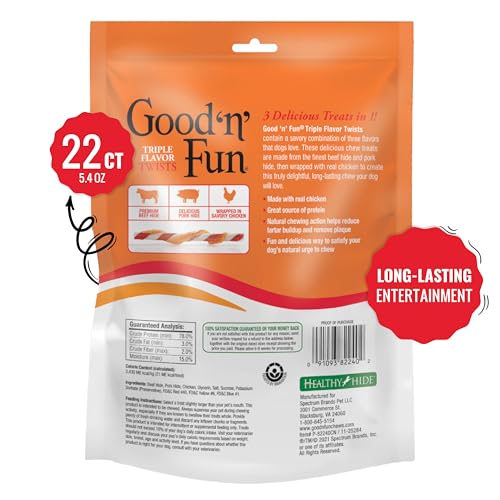 Good 'n' fun brand contains a savory smorgasbord of flavors that dogs love most. These delicious chew treats are made from the finest ingredients, including premium beef hide and real chicken, to create truly delightful, long-lasting treats your dog will love. Good 'n' fun Triple flavor twists contain a savory combination of three flavors that dogs love most. These delicious chew treats are made from the finest rawhide, then wrapped with artificial pork flavor and real chicken to create this truly delightful, long lasting treat your dog will love.
