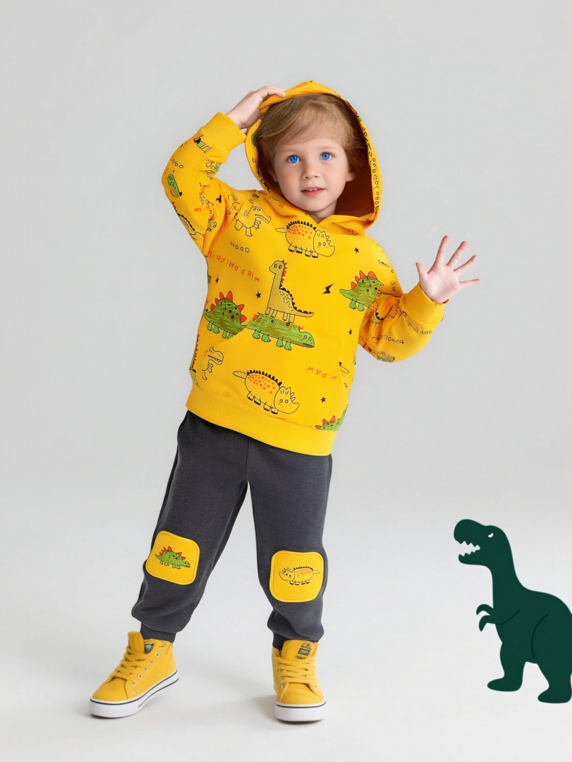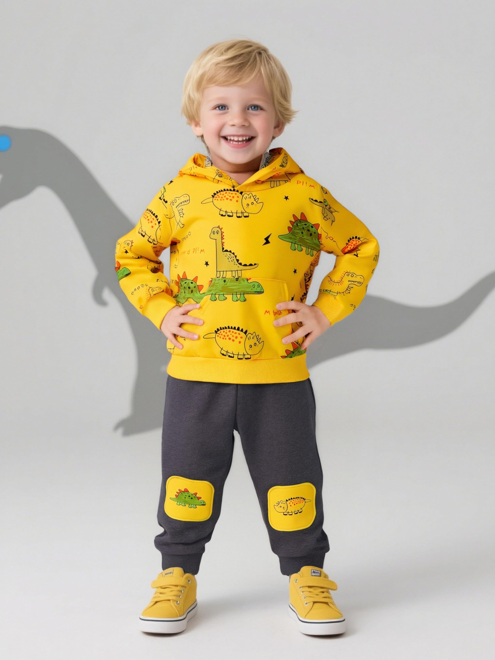 Description Adorable dinosaur hoodie and jeans sets for baby boys 2t-6t! Our cotton blend clothing set features cute prints for fall winter seasons. Perfect outfit for daycare, park visits, and family outings. Key Features: Dinosaur hoodie with cozy fleece lining + patch jeans with reinforced knees. Long sleeve top protects from chill while elastic waist pants allow easy movement. Machine washable fabric stays soft after repeated washes. Size Guide: 2T (28-32" height), 3T (32-36"), 4T (36-40"), 5-6T (40-44"). Color Options: Blue (navy dino print), Yellow (sunshine dino), Apricot (peach dino). Why Moms Love It: ▶️ Time-saving coordinated sets ▶️ Durable for active toddlers ▶️ Growth-friendly roomy cuts ▶️ Party-ready cute designs. Care: Machine wash cold/Tumble dry low. Imported.