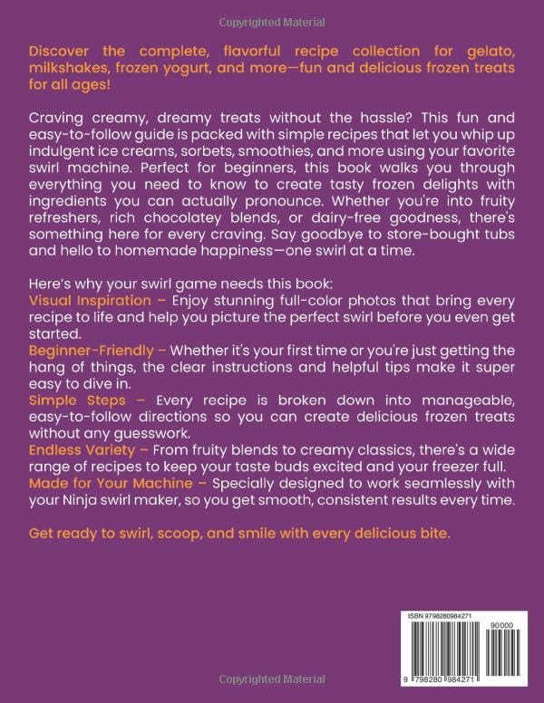 ♥♥Full-Color Premium Printing Edition with Vibrant Color Pictures of Each Finished Meals for the Recipes♥♥ Discover the complete, flavorful recipe collection for gelato, milkshakes, frozen yogurt, and more—fun and delicious frozen treats for all ages! Craving creamy, dreamy treats without the hassle? This fun and easy-to-follow guide is packed with simple recipes that let you whip up indulgent ice creams, sorbets, smoothies, and more using your favorite swirl machine. Perfect for beginners, this book walks you through everything you need to know to create tasty frozen delights with ingredients you can actually pronounce. Whether you're into fruity refreshers, rich chocolatey blends, or dairy-free goodness, there's something here for every craving. Say goodbye to store-bought tubs and hello to homemade happiness—one swirl at a time. Here’s why your swirl game needs this book: Visual Inspiration – Enjoy stunning full-color photos that bring every recipe to life and help you picture the perfect swirl before you even get started. Beginner-Friendly – Whether it's your first time or you're just getting the hang of things, the clear instructions and helpful tips make it super easy to dive in. Simple Steps – Every recipe is broken down into manageable, easy-to-follow directions so you can create delicious frozen treats without any guesswork. Endless Variety – From fruity blends to creamy classics, there's a wide range of recipes to keep your taste buds excited and your freezer full. Made for Your Machine – Specially designed to work seamlessly with your Ninja swirl maker, so you get smooth, consistent results every time. Get ready to swirl, scoop, and smile with every delicious bite.