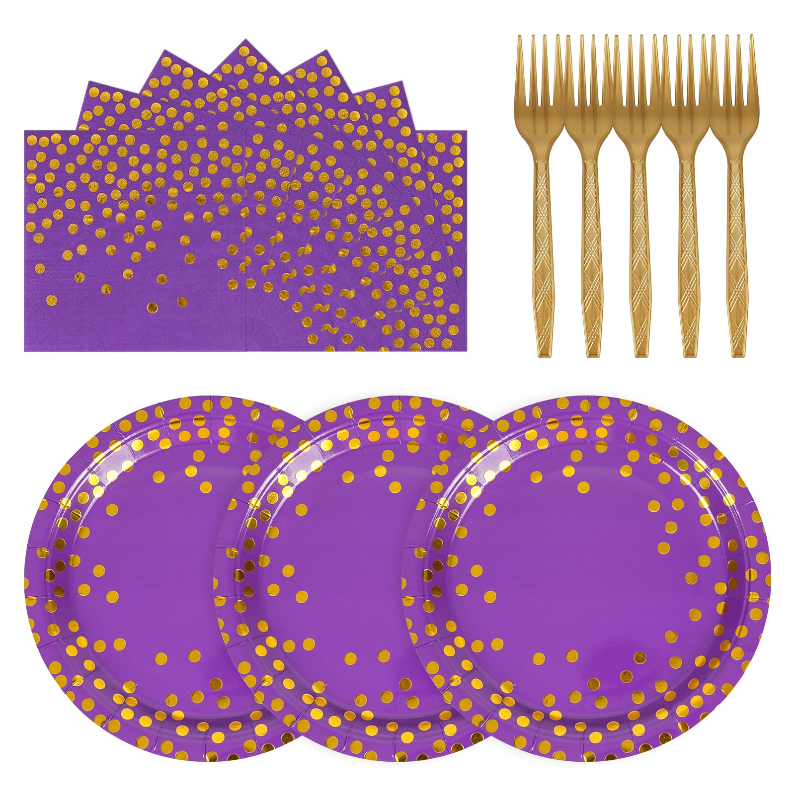 【HIGH QUALITY MATERIALS】: Our purple and gold dot paper plates are made of 350gsm thickened eco-friendly paper, not easy to break or tear, durable, safe and non-toxic, BPA free biodegradable, convenient and environmentally friendly, no need to worry about harming the environment. The napkins are made of food grade water-based ink, highly absorbent and very skin-friendly.Please do not microwave the paper plates!