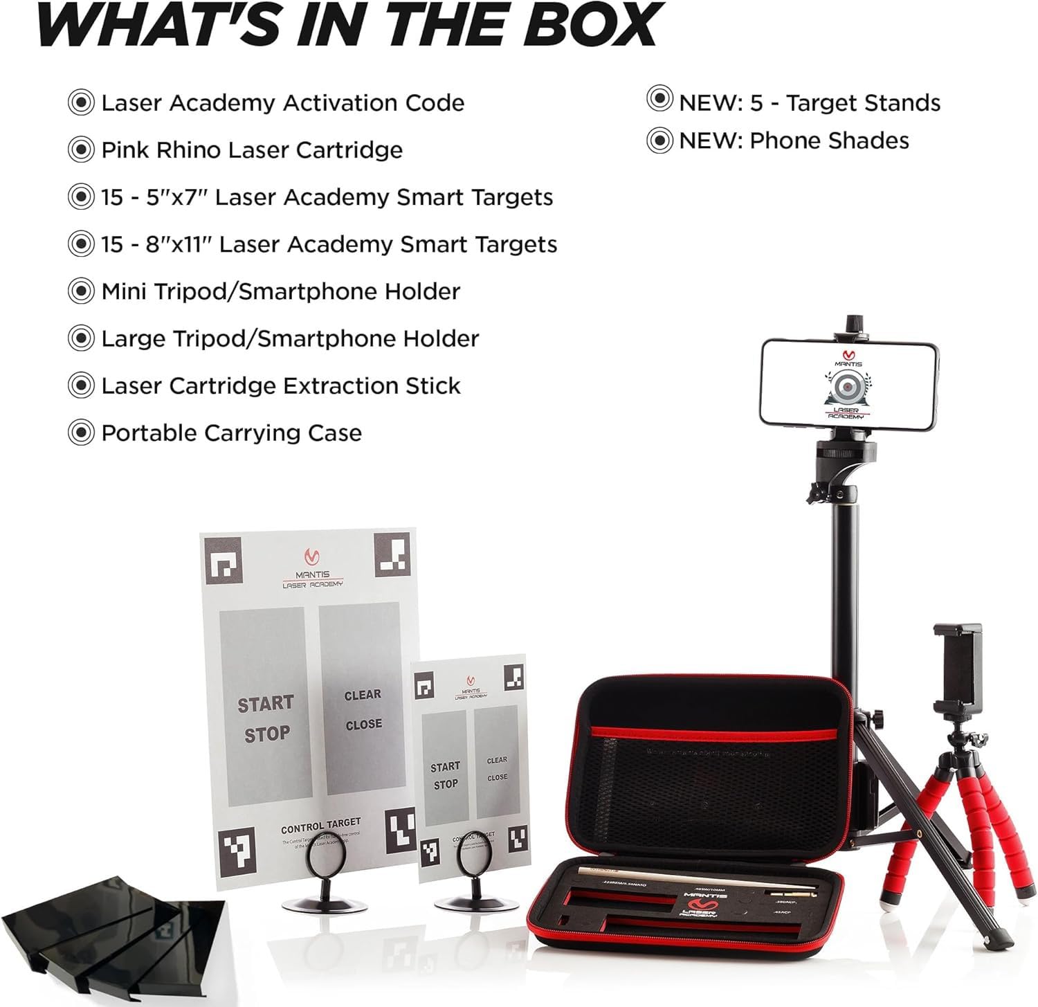 STANDARD KIT INCLUDES - Full Access Code to Mantis Laser Academy, Pink Rhino Laser, Complete Set of 5"x7" and 8”x11” Laser Academy Smart Targets, Mini Tripod, Large Tripod, Smartphone Holder, Laser Cartridge Extraction Stick, Portable Carrying Case, 5 Target Stands, and Phone Shades.