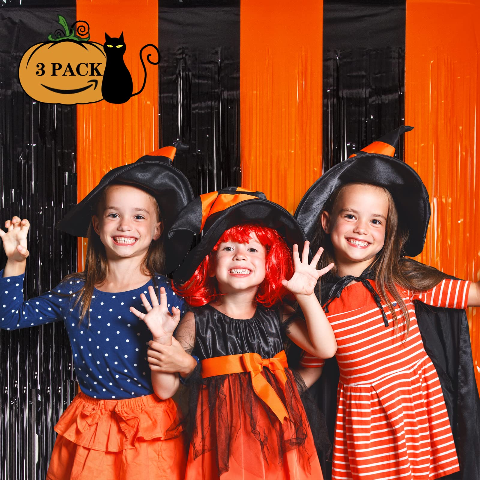 🎃【 PACKAGE 】: 3 pack black and orange foil fringe curtains, Extra large size (width x drop) 3.3 x 6.6 ft each, perfect for HALLOWEEN party Thanksgiving party photo backdrop decoration.