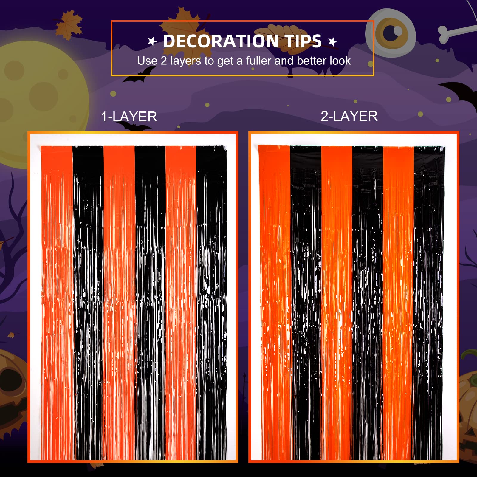🎃【 TINSEL MATERIAL 】: These black and orange metallic foil fringe curtains are made of tinsel. They are lightweight and durable fringe curtains. These high-quality fringe curtains are unbreakable and can be used for a long time.