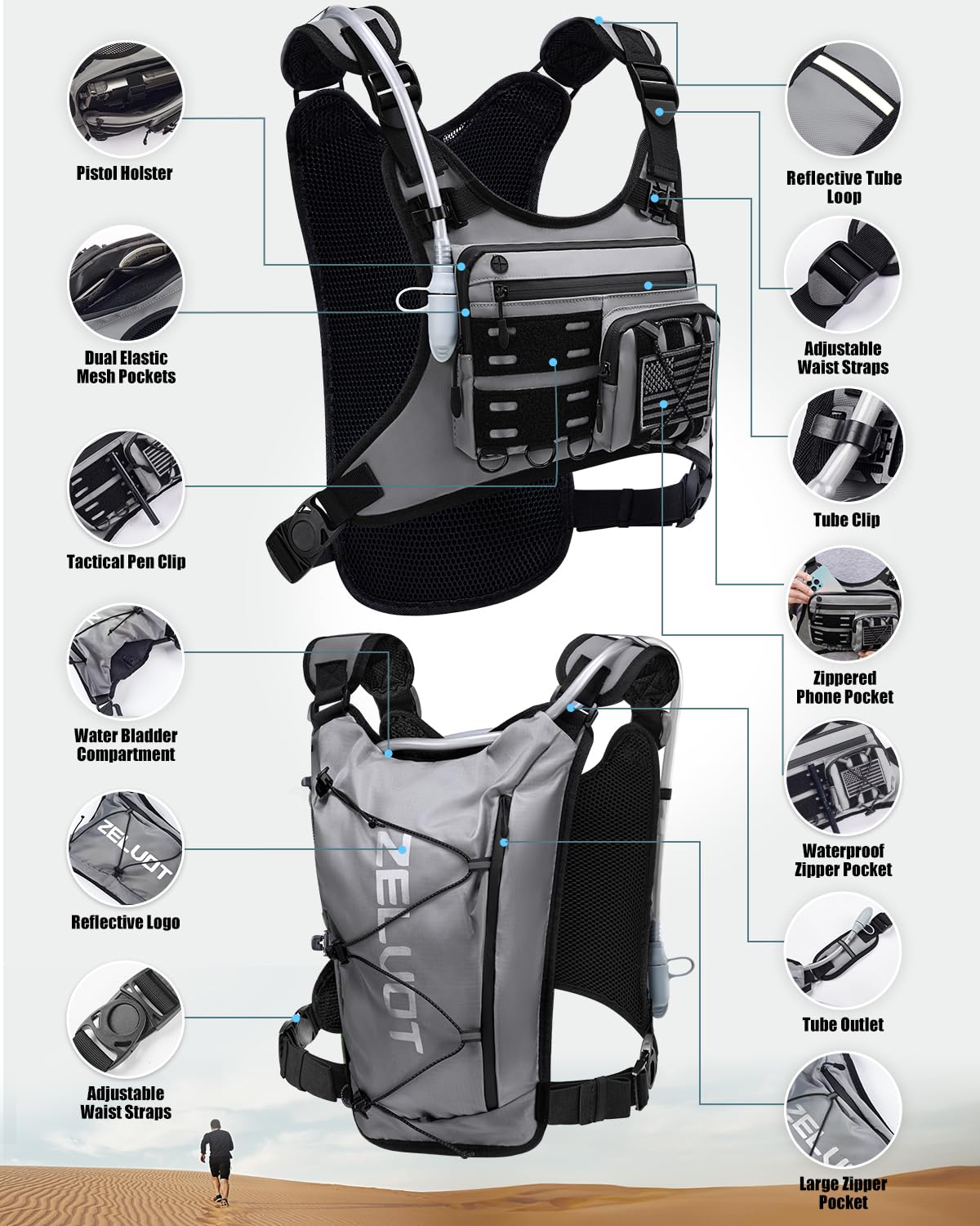 Plenty of Storage - This chest bag features 3 waterproof zippered front pockets to securely hold essentials like your phone, keys, and energy gels. A detachable, bounce-free pistol holster ensures secure storage for small to mid-sized pistols, while the tactical pen slot keeps emergency gadgets within easy reach. Two large back pockets fit a water bladder, towel, extra clothing.
