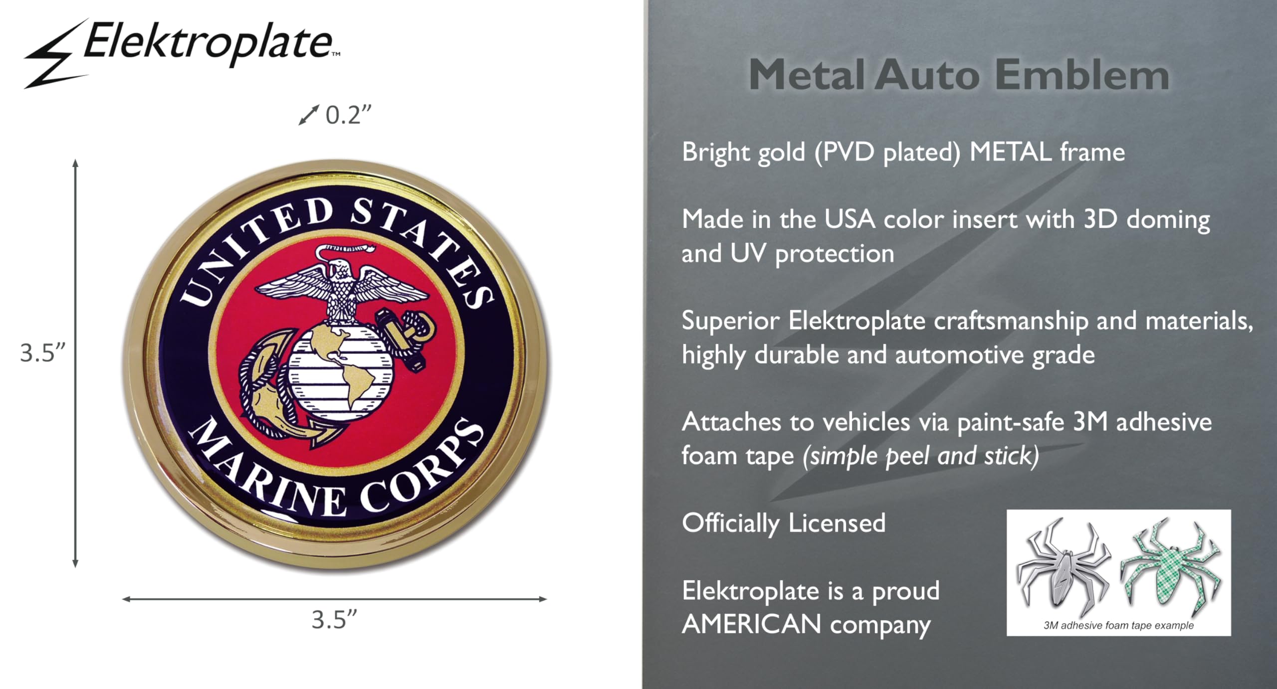Officially Licensed United States Marines Crest Gold Frame auto emblem (3.5" x 3.5" x 0.2") by Elektroplate. An all-metal emblem with a bring gold PVD plated metal frame and a full-color domed decal insert. The decal is UV-protected with a laminated 1/8” thick PVC made to withstand any outdoor conditions. The emblem attaches via paint-safe 3M adhesive foam tape. All Elektroplate car emblems are comprised of a chrome metal finish made to withstand harsh outdoor conditions. This auto emblem will look brand new for years to come. Our high-end auto emblems are the perfect way to showcase your patriotism and military pride everywhere you drive. In addition, all Elektroplate chrome emblems are packaged in elegant retail packaging to make a great gift!