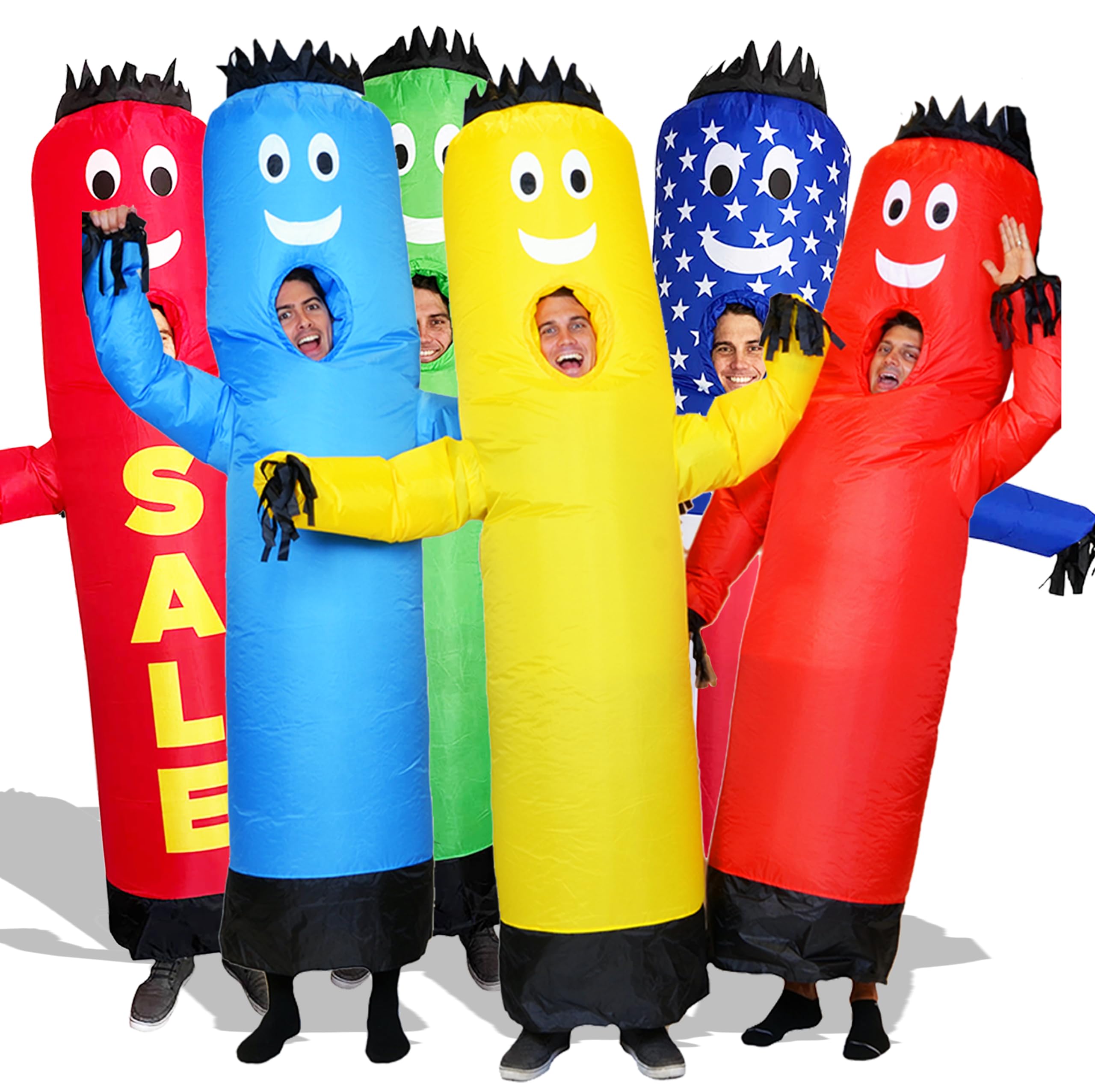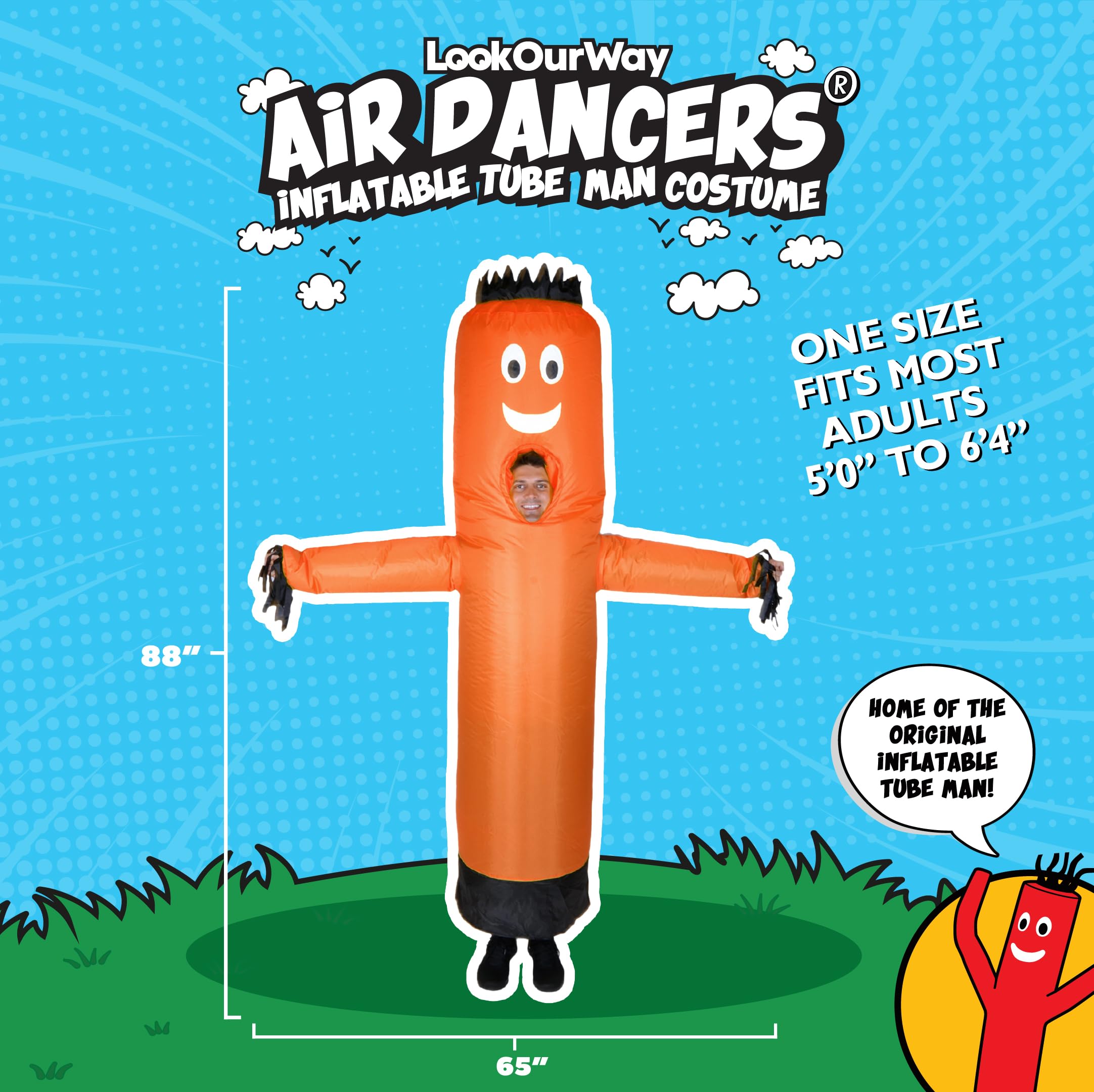 Description Get ready to be the life of the party with the LookOurWay Air Dancers Wacky Inflatable Tube Man Costume! This hilarious inflatable tube man costume is a wearable version of the iconic Air Dancers inflatable tube guy, making it the ultimate inflatable Halloween costume for adults. Perfectly designed to replicate the original wavy arm guy, this wacky inflatable tube man costume features the instantly recognizable face, wild flailing arms, and vibrant color thatβs sure to grab attention at any event. Easy to wear and inflate, this inflatable tube guy costume comes with an integrated blower and battery pack, fitting most adults comfortably. Whether youβre 5'0" or 6'4", youβll have no trouble dancing, waving, and flailing your arms all night long. With superior design and comfort, this wavy arm guy costume allows your face and hands to be outside the costume, making it easier to breathe, move, and have fun.