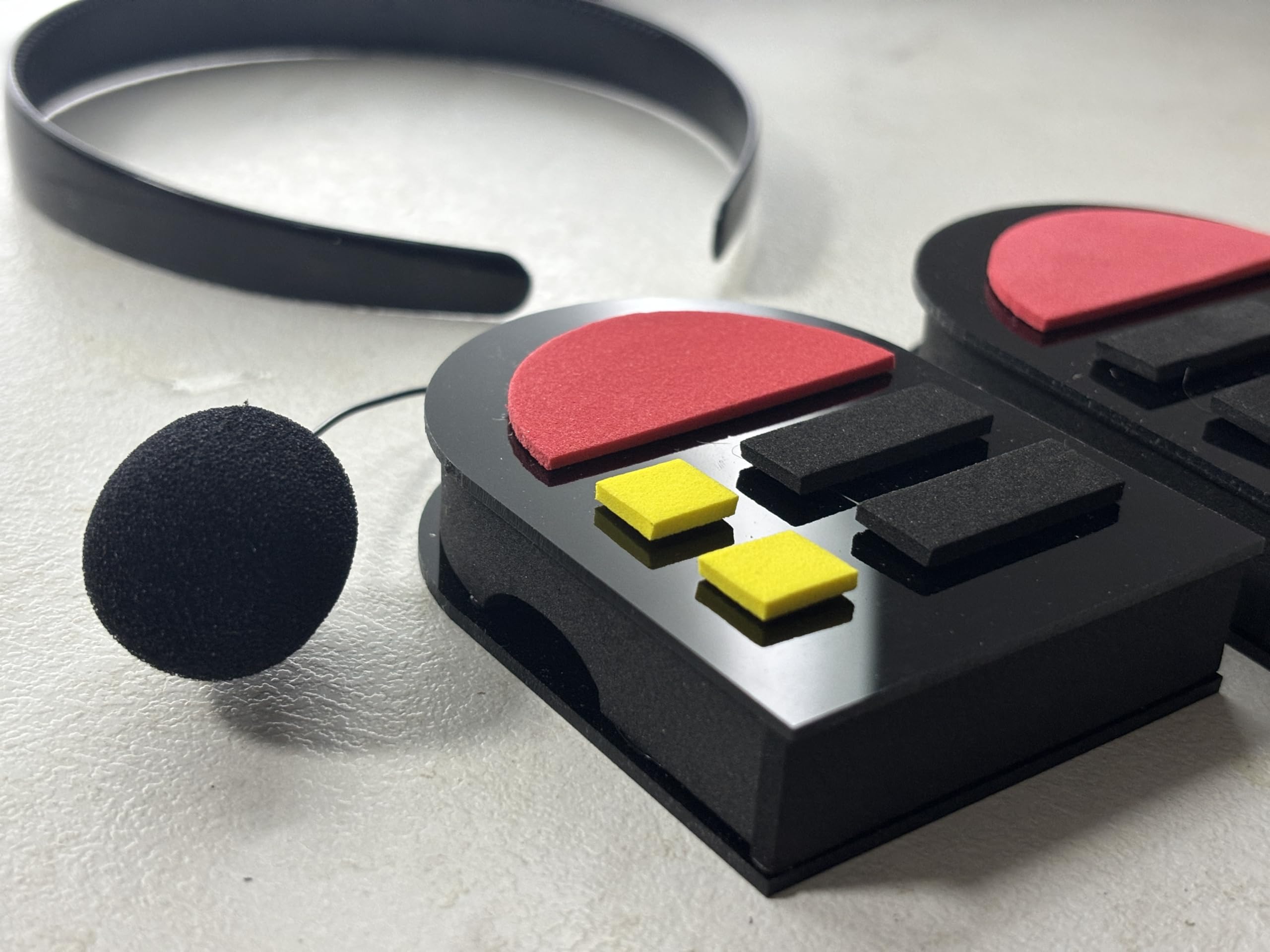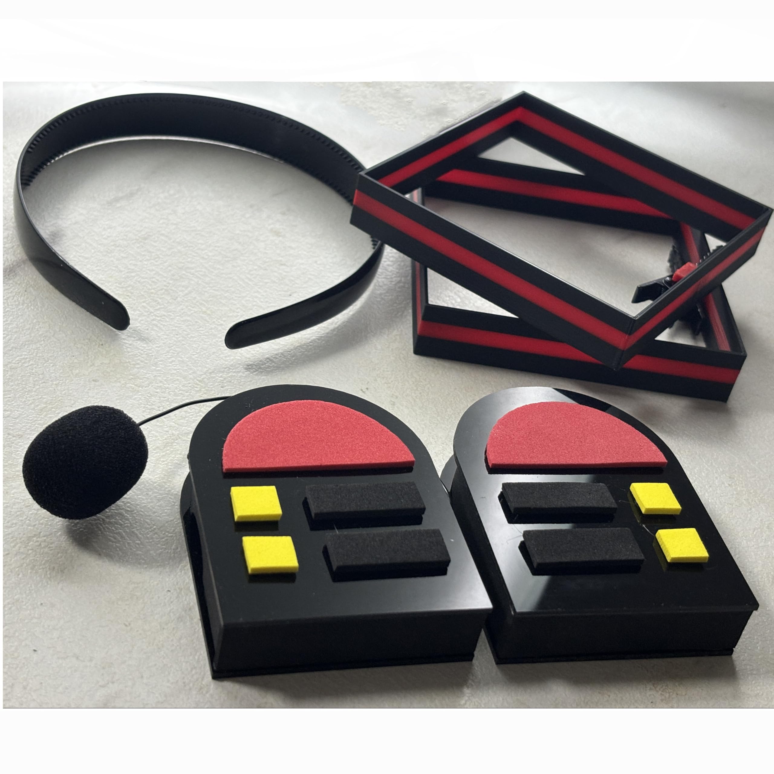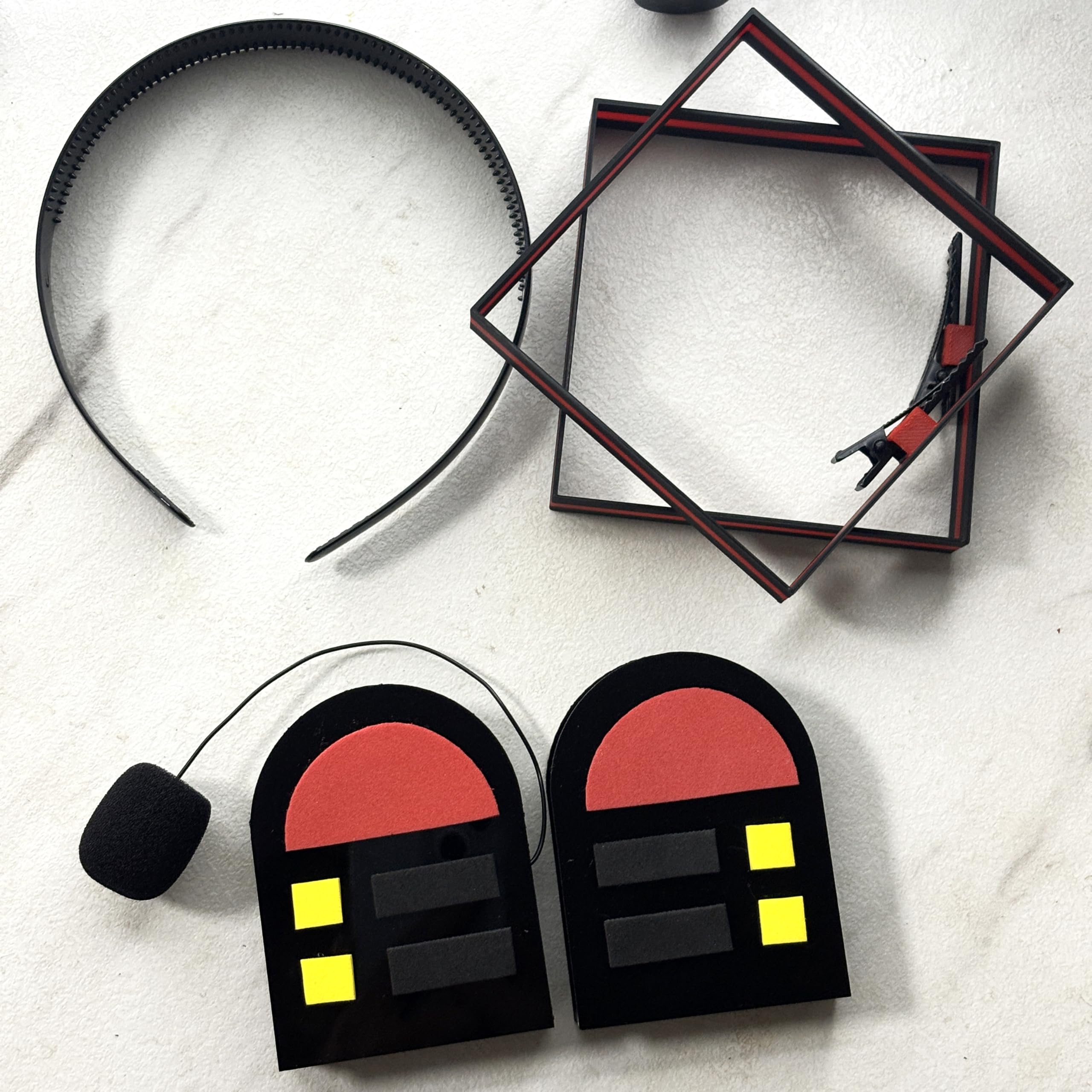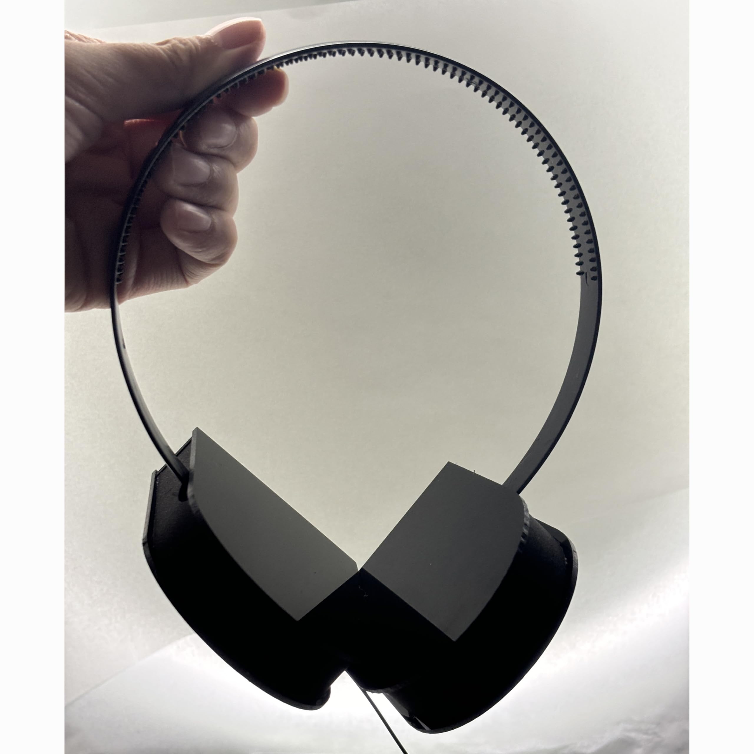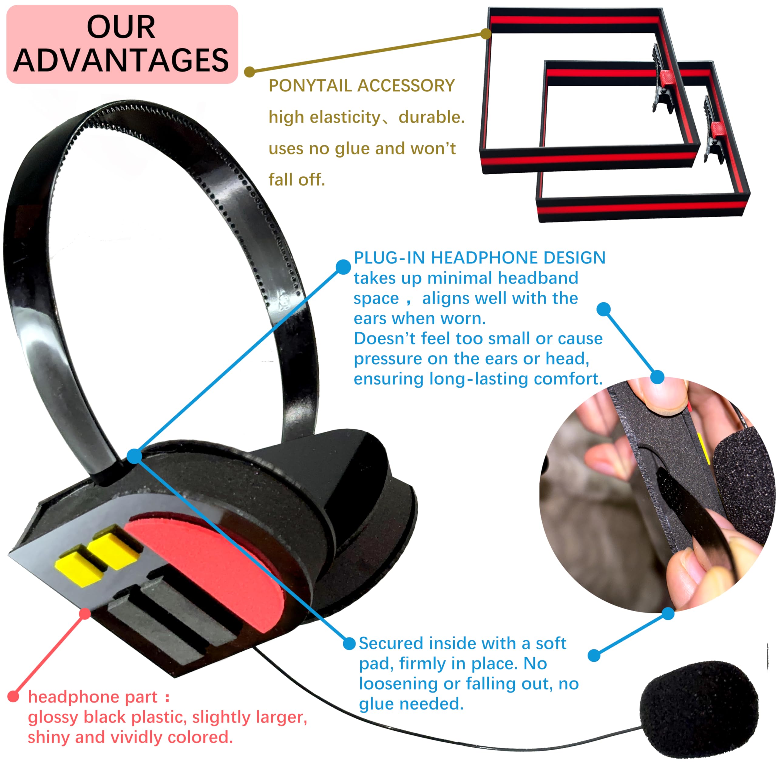 Headphone part: Lacquered high-reflective black plastic shell (to match the clothing) Black paper foam is handmade, we gave up 3D printing, because the 3D printing material is too hard, and the earphone part cannot form a suitable bite with the ear with the tail of the headband, which will be uncomfortable to wear, and it is easy to clamp the ear and cause discomfort.Fit in size.easy to fix.