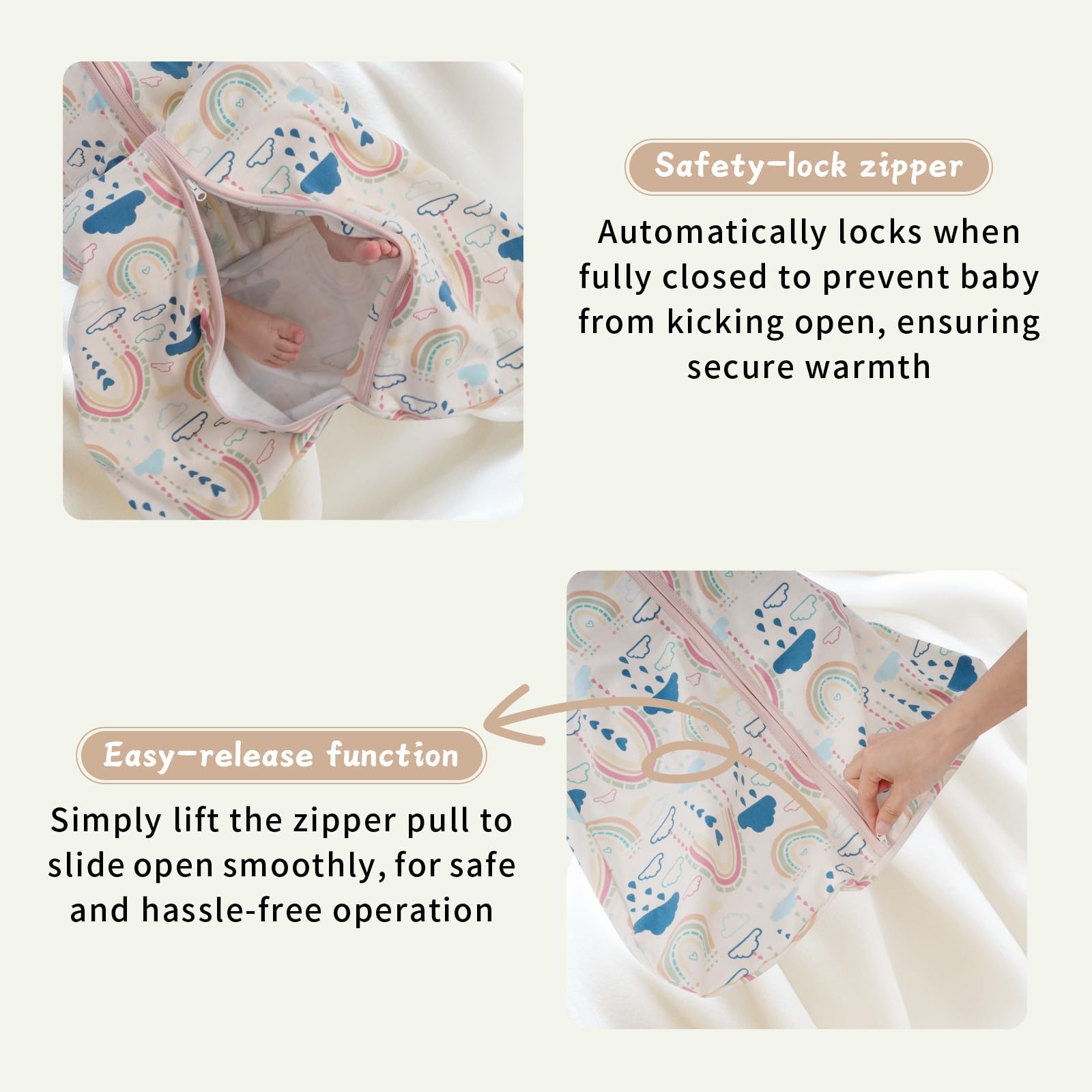 Safety-Lock Zip:The sleep sack's zipper automatically locks when fully closed to prevent your baby from kicking it open, ensuring all-night warmth retention. With its easy-release feature, simply lifting the zipper pull allows smooth one-handed opening for effortless nighttime care