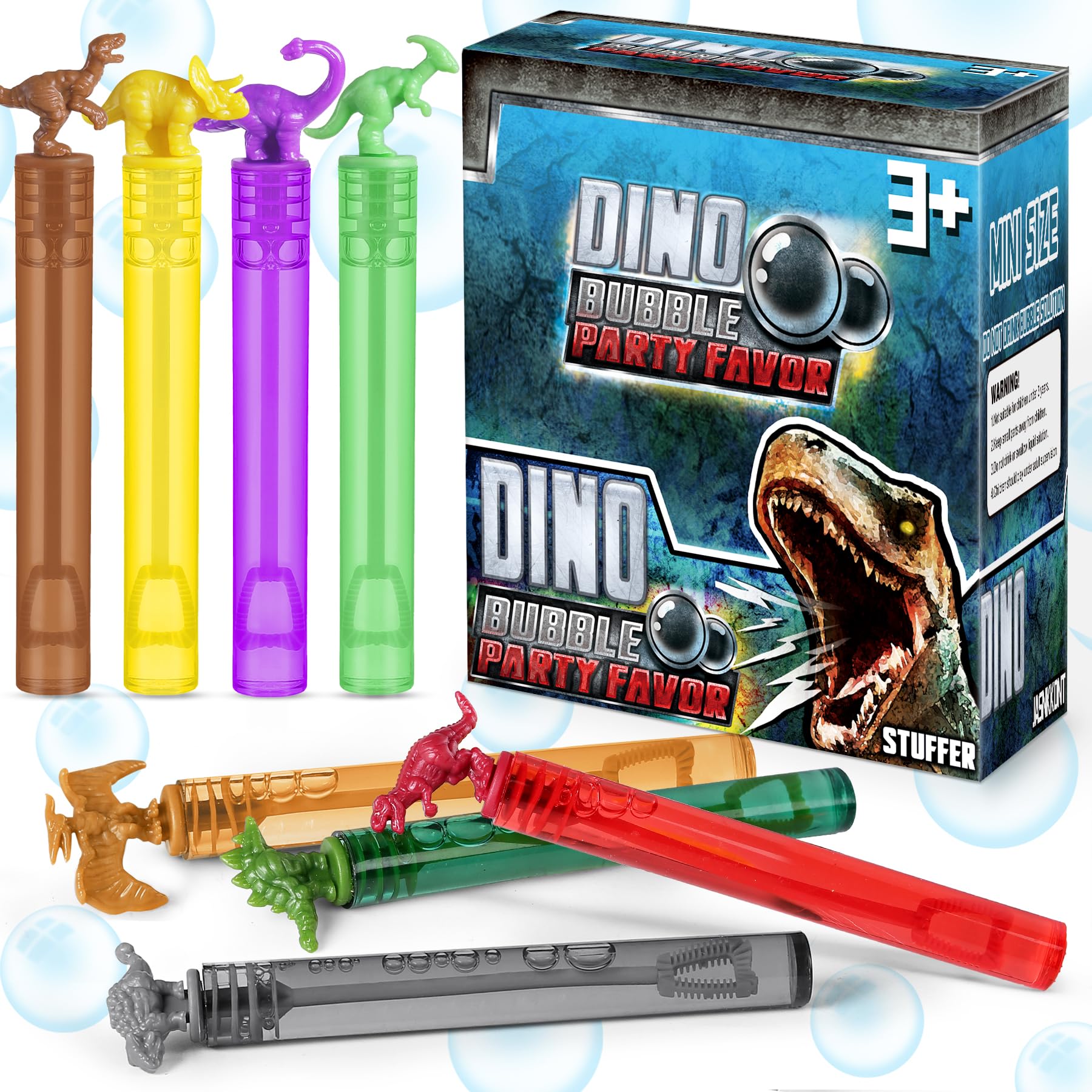 Dinosaur Design: 32pcs mini bubble Wands bulk (8 designs, 8 colors), Jurassic style makes kids feel like walking into the real dino world. Neon color bubbles open up outdoor play time; everyone deserves to have themed creative toys