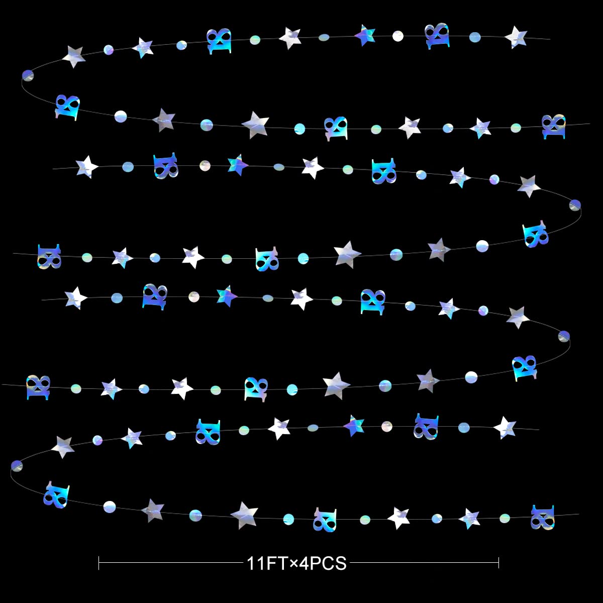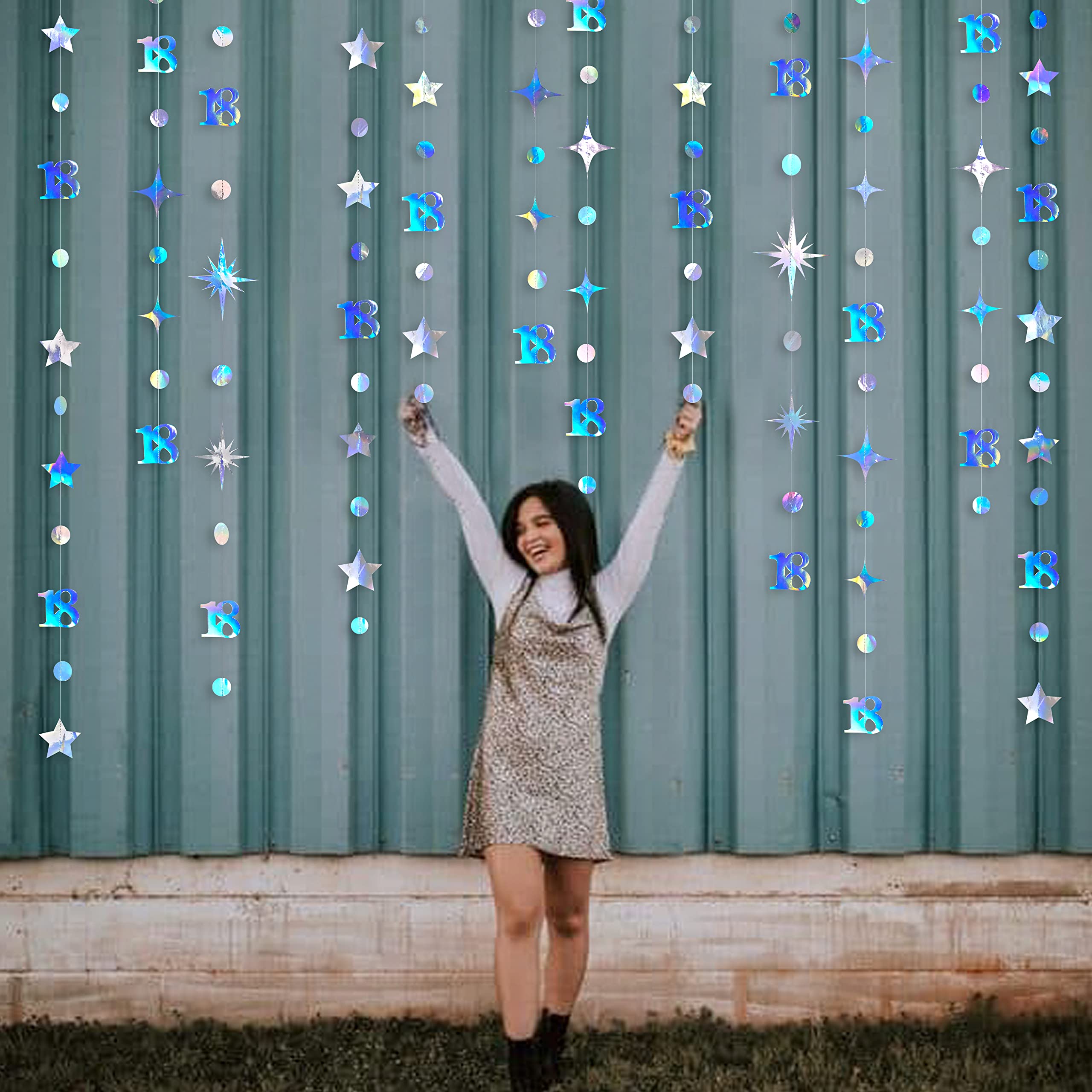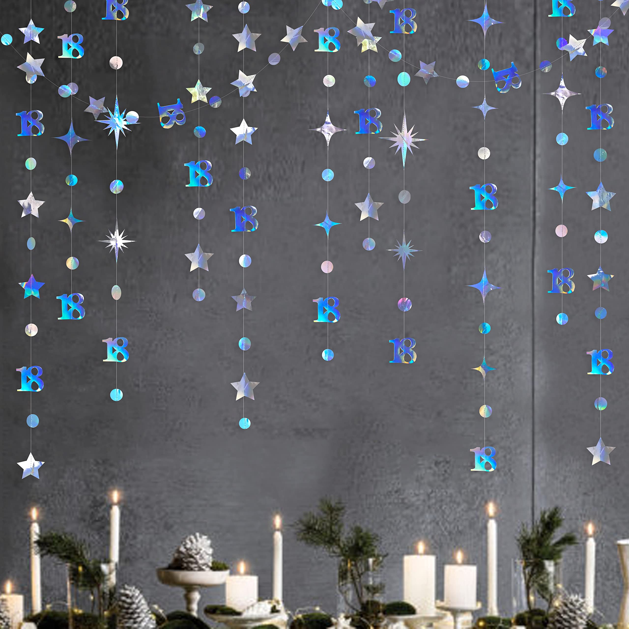 👍 Package includes - 4 strings of 11.5 feet/3.5 meters iridescent holographic number 18 sparkling twinkle star and circle dots garlands , totally is 46 feet/14 meters