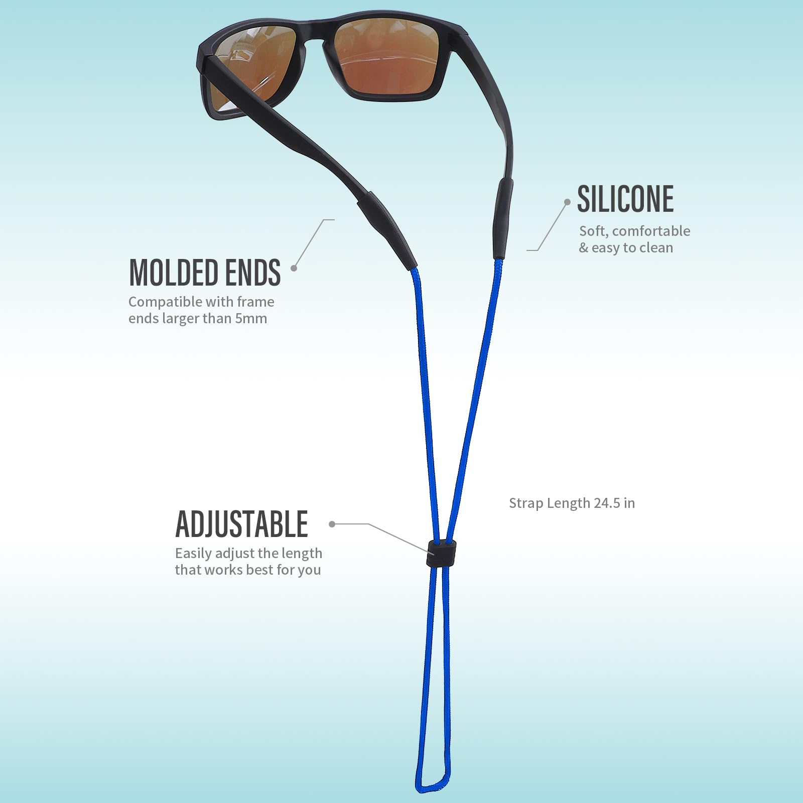 Sizing And Specs: Our eyewear retainer Compatible with frame ends larger than 4.5mm. The adjustable design and maximum length of 25 inches are enough to fit all head and neck sizes.