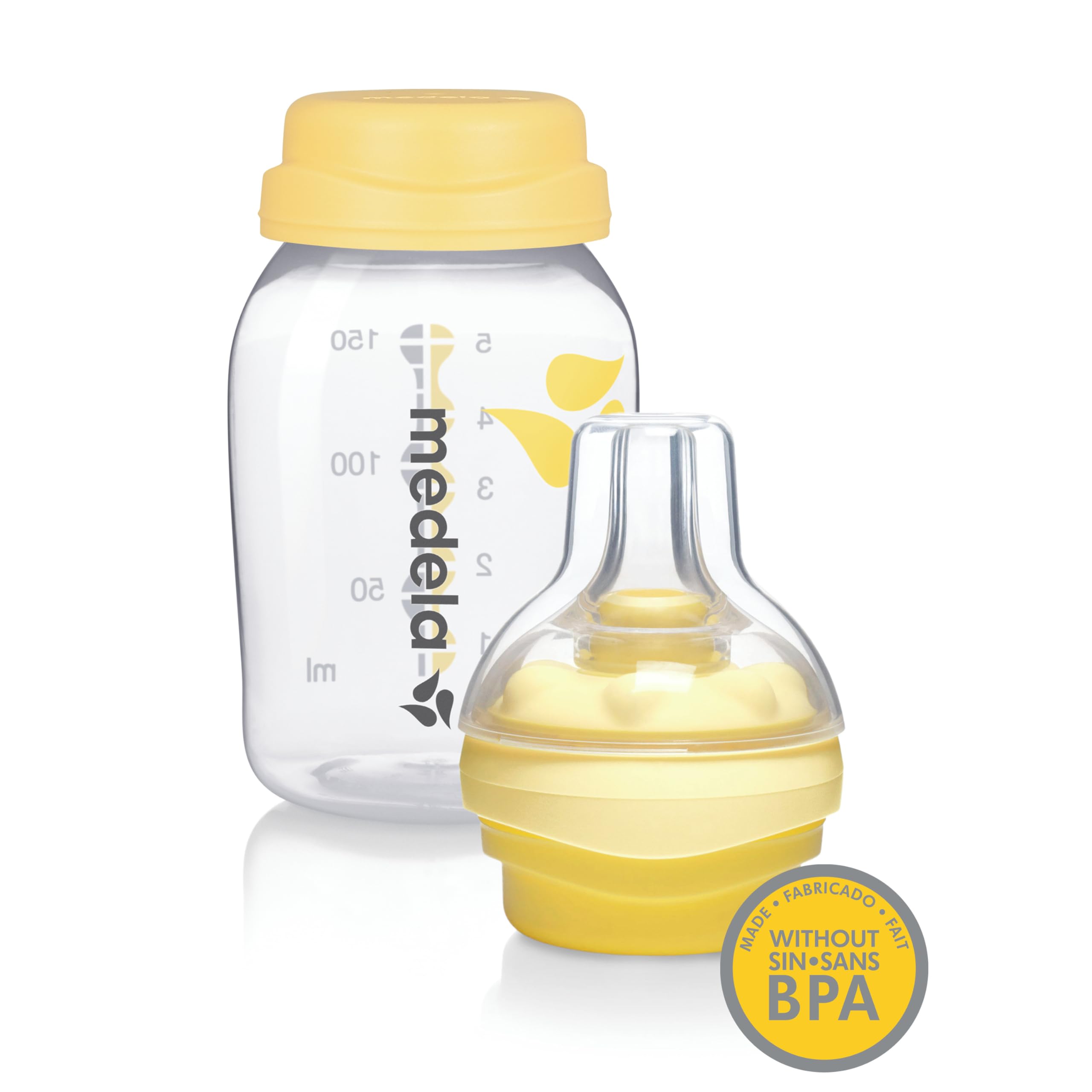 Calma by Medela has a patented air-vent system that allows milk to flow only when baby creates suction. It is suitable for all ages, eliminates the need for flow rate adjustments, and fits with Medela collection and storage bottles. Calma can be cleaned, stored, and transported, and is made without BPA. Whatβs Included: (1) nipple, (2) 5 oz/150 mL bottle, (1) cap, (2) lids.