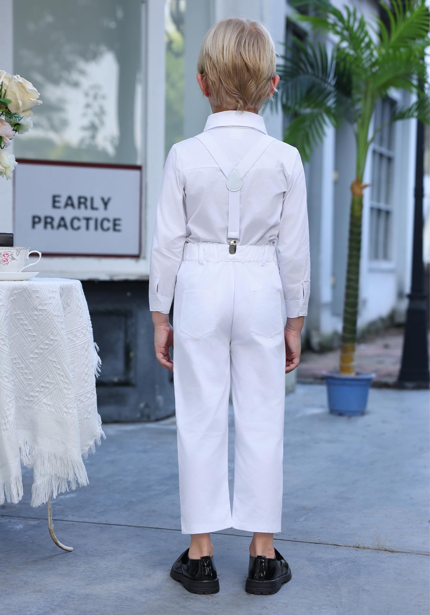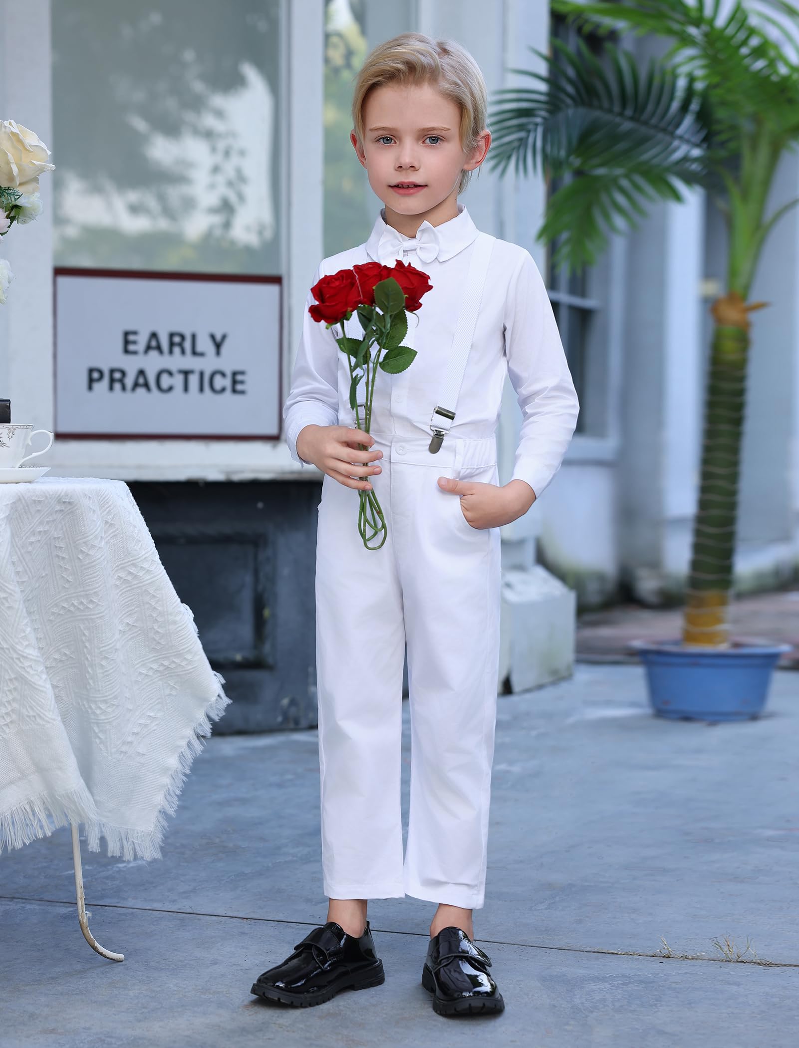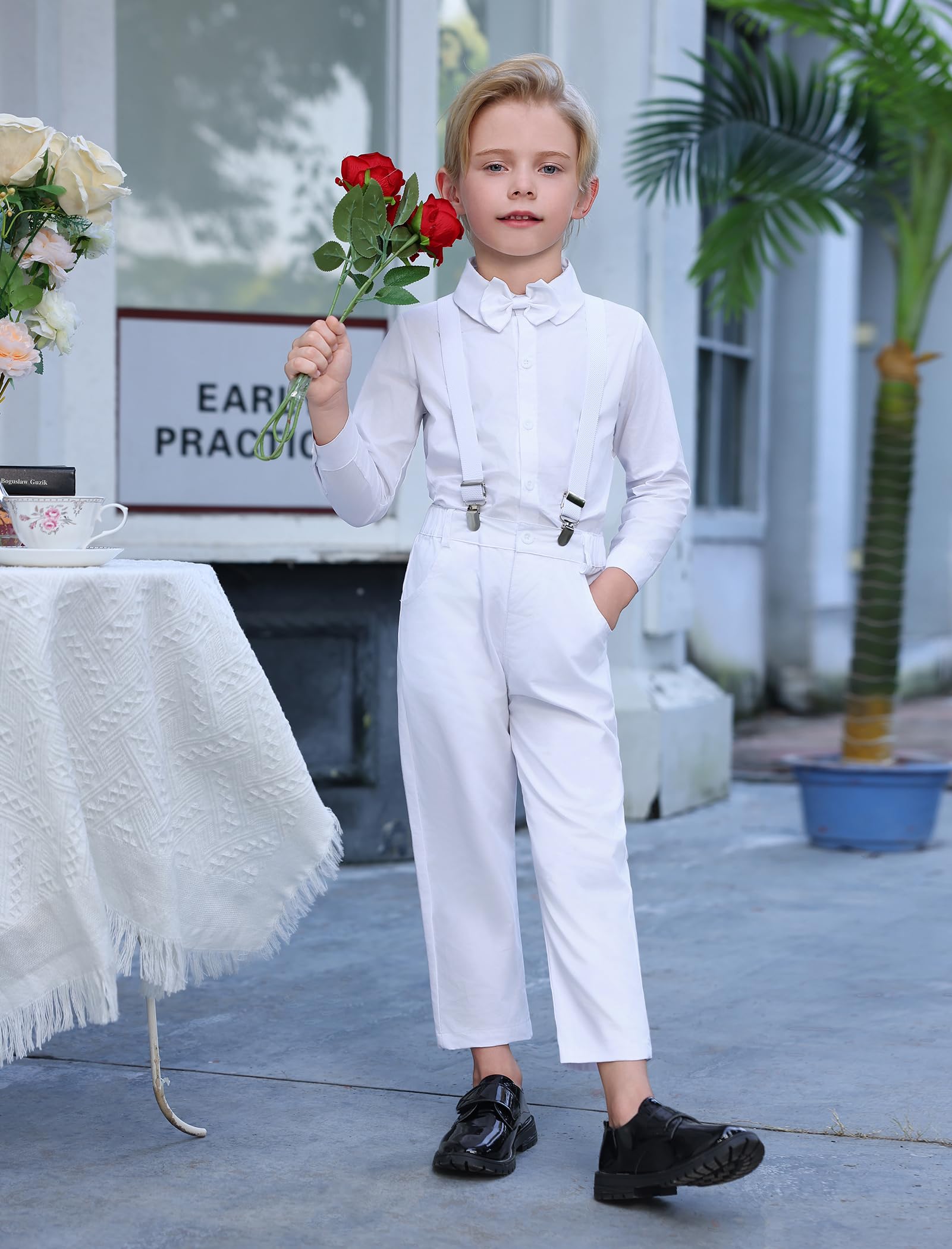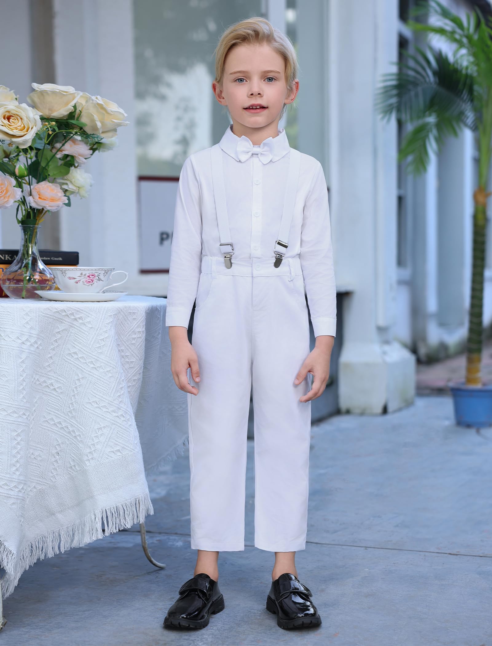 LONG SUSPENDER PANTS: Kids boys long sleeve button down shirt jeans pants classic tuxedo party outfit. Elastic suspender bib pants, Y-back clip-on braces with stars, elastic waistband with buttons design to fix the braces strap, adjustable elastic straps can adjust the length for best comfort. Solid plain color pants or denim pants with ripped distressed holes, practical pockets at front and back, complete a leisure and good-looking for your prince, son, grandson