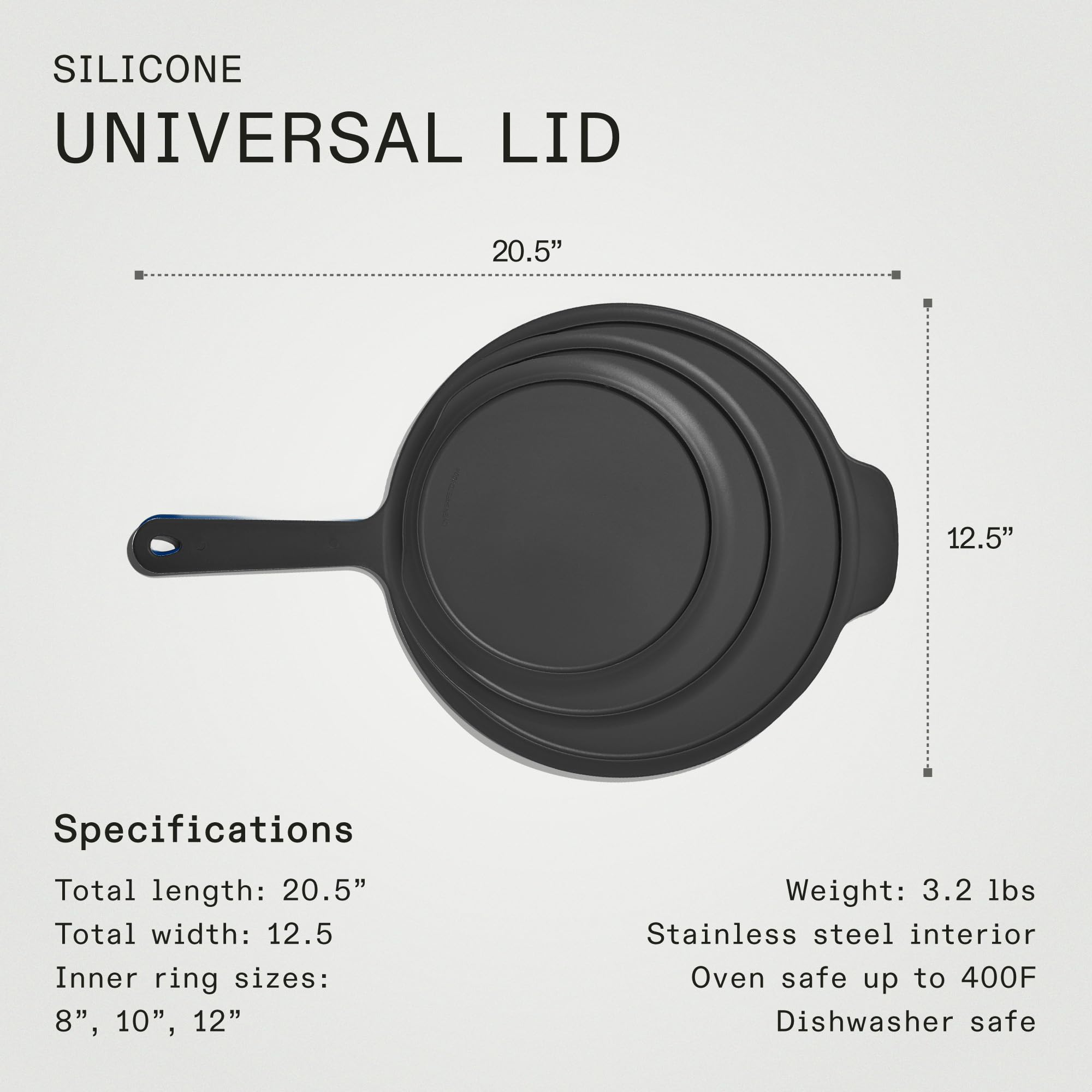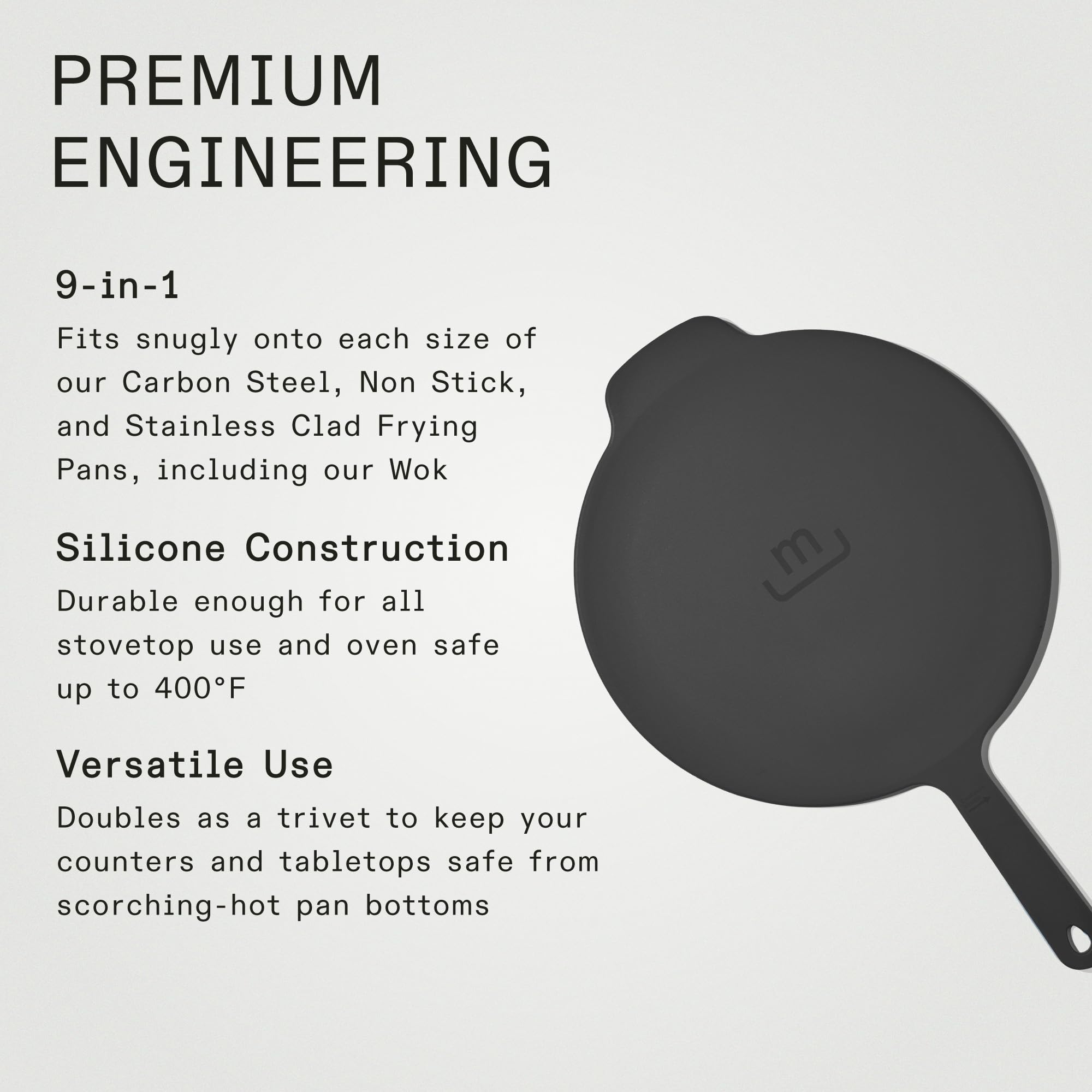 Essentially Designed - Made In Frying Pan Silicone Universal Lid fits various cookware items like Carbon Steel, Non Stick, and Stainless Steel Frying Pans, including our Wok