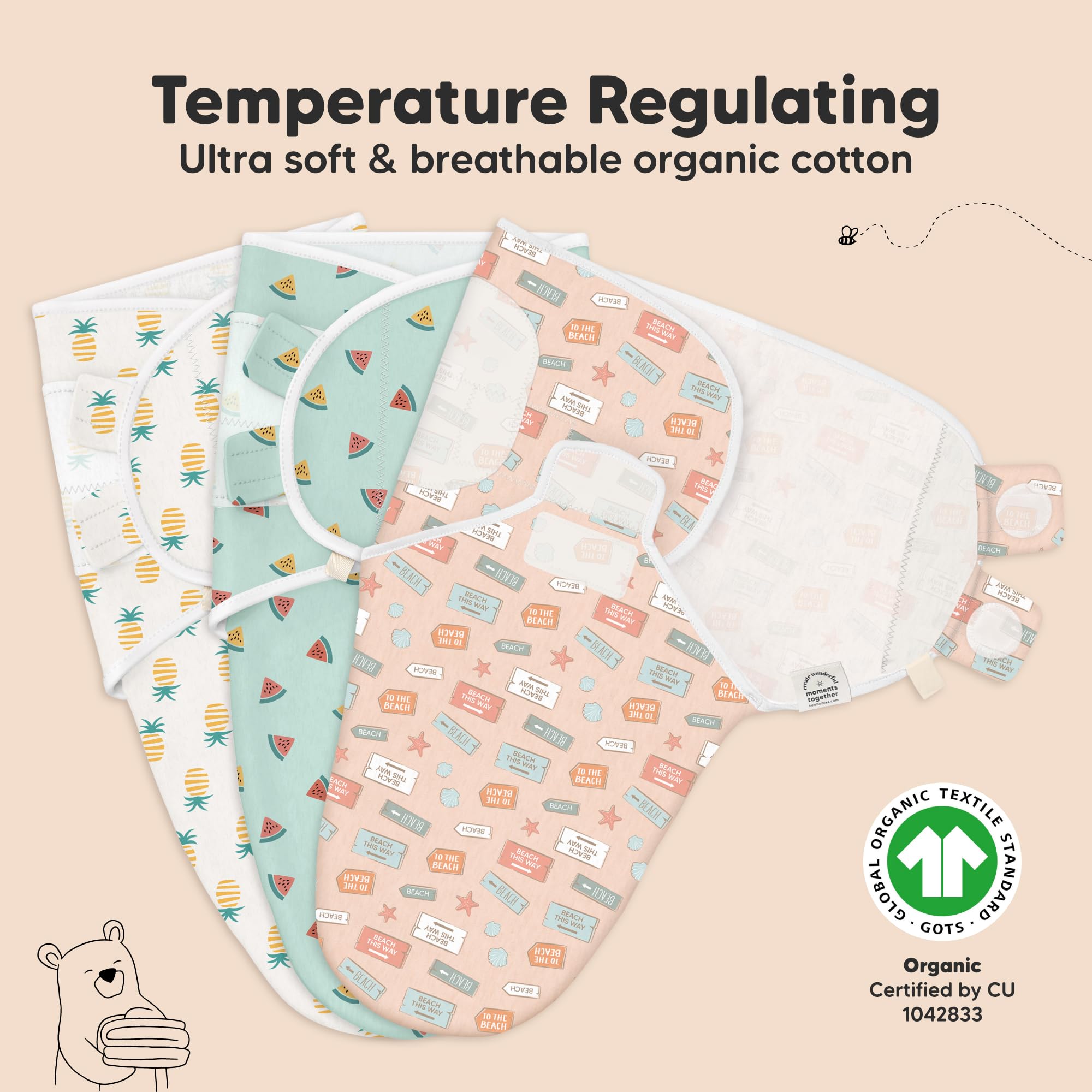 Breathable & Temperature-regulating - Our Soothe Swaddle for newborns is made with ultra-soft Organic Cotton (GOTS Certified by CU 1042833), it is lightweight and highly breathable which makes it a highly-raved newborn swaddle sack for all seasons.