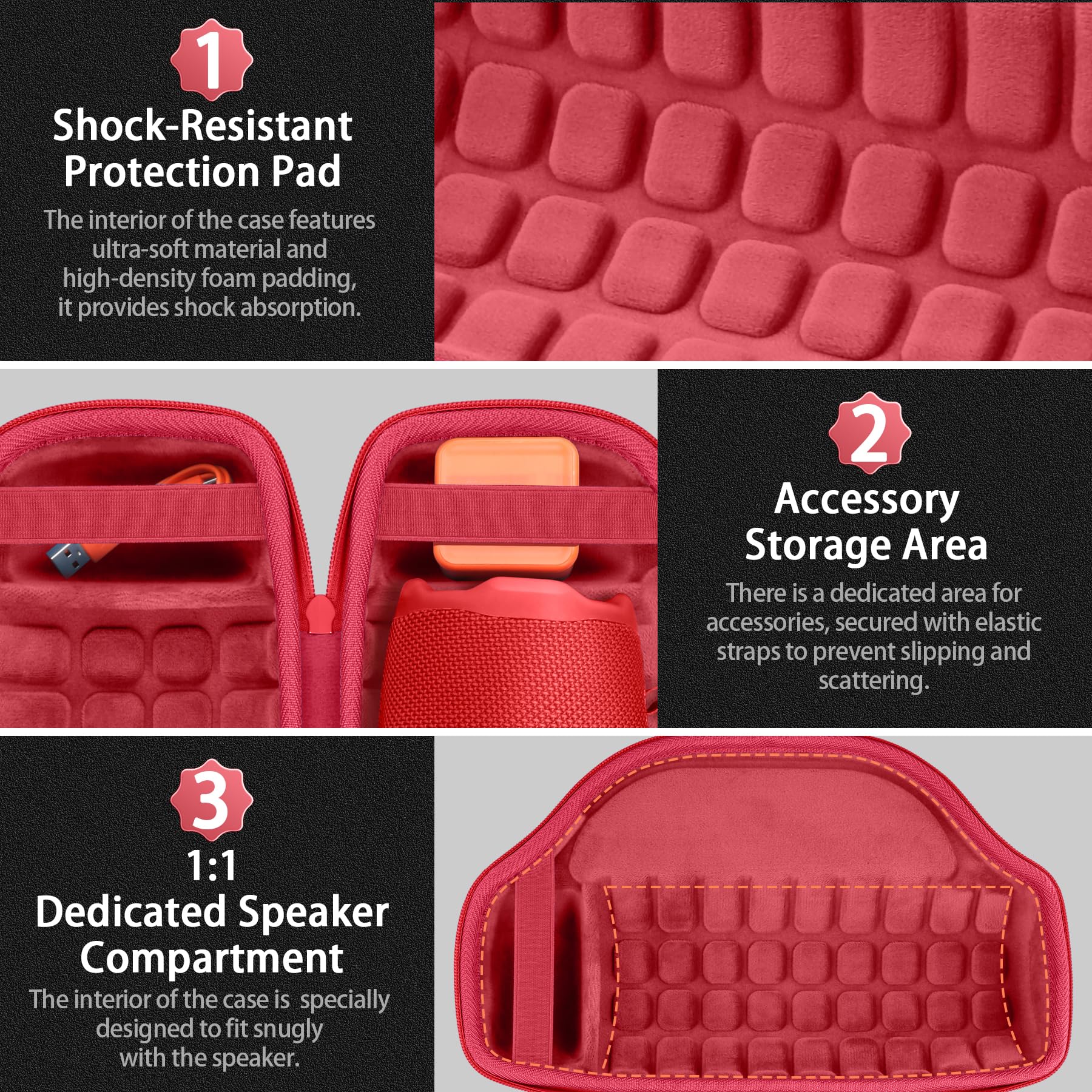 Crafted with precision, this NEW Charge 6 portable wireless speaker protective case is designed to snugly encase the Charge 6 portable waterproof outdoor speaker. The bocinas Charge 6 waterproof speaker portable speaker case has two accessories storage areas to accommodate the Charge 6 usb-c quick charger and Charge 6 speaker charging cable more accessories. This elastic strap that securely hold the speaker accessories in place, preventing movement or collision during transport.