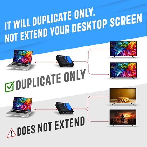 HDMI DUPLICATOR 1 x 2 - Duplicates Mirror Displays to 2 TVs, NOT FOR LAPTOPS OR PC TO EXTEND MULTI MONITORS. ONLY Split one HDMI input signal to two HDMI output signals identical to the input signal.Supported resolution: up to 4K/30Hz, 1080p, 720p, VGA to WUXGA.