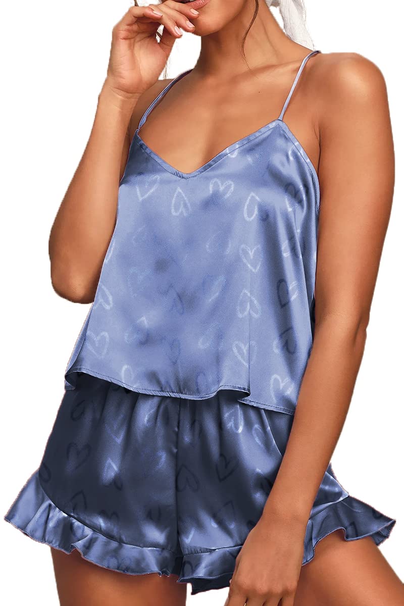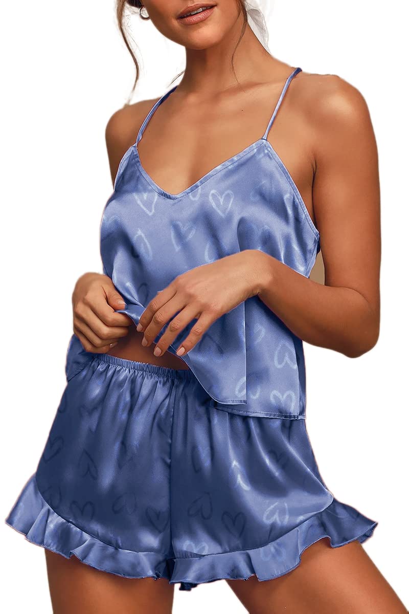 The cute satin silk cami pajamas tops features v neck,low cut,racerback,adjustable straps,the shorts features high waisted,elastic waist,casual loose style.The cute and sexy pajamas sets will make you look more flattering,elegant for your sweet night.