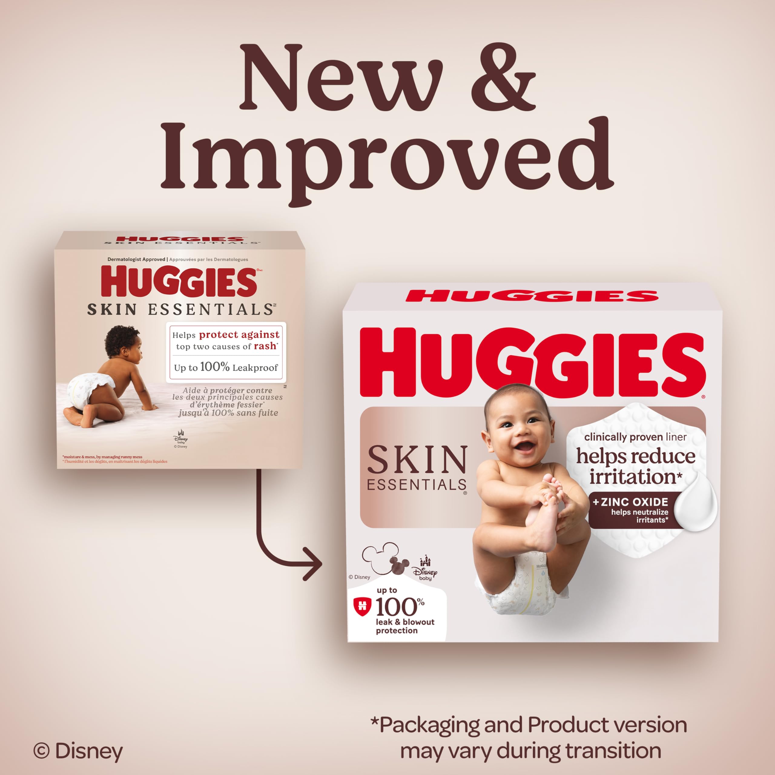 Your baby’s skin health is essential to their overall health and comfort, and Huggies Skin Essentials Baby Diapers want to help you make it a priority. Made with a SkinProtect Liner that helps lock away moisture and runny mess, Skin Essentials infant diapers help protect against the top two causes of rash.* Clinically tested safe for sensitive skin, Huggies Skin Essential newborn diapers are hypoallergenic and free of fragrance. These infant diapers are made without phthalates, parabens, elemental chorine, lotions & latex* (*natural rubber). Extremely soft for your baby’s comfort, Skin Essentials newborn diapers feature a soft, breathable outer cover and is up to 100% leak free. Additionally, Skin Essentials diapers feature a wetness indicator that changes color when wet to alert you when the diaper needs to be changed. Huggies Skin Essentials diapers, wipes, and Pull-Ups training pants give you everything you want for your child's skin and nothing you don't. They’re dermatologist approved and designed to help keep skin clean and healthy from baby to BIG KID. These baby diapers feature Disney patterns as cute as you, baby! Huggies Skin Essential Diapers are available in size Newborn (6-9 lb.), size 1 (8-14 lb.), size 2 (12-18 lb.), size 3 (16-28 lb.), size 4 (22-37 lb.), size 5 (27+ lb.), and size 6 (35+ lb.). (*mess (by managing runny mess) and moisture. K-C # 24080 (2023))