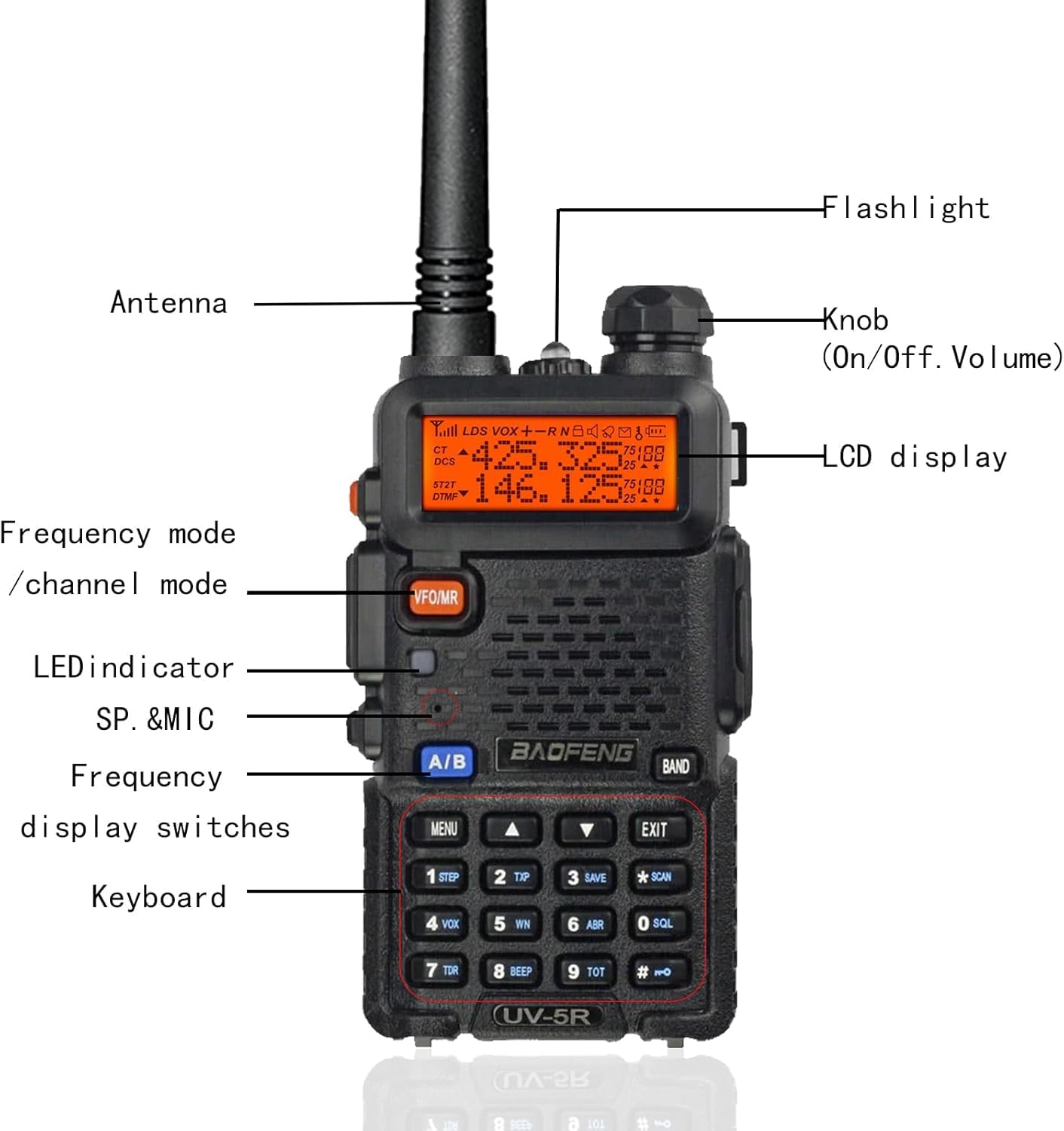 CHIRP Compatible, Emergency Alarm, LED Flashlight, CTCSS/CDS, VOX/Hands Free, 9 Levels Squelch, Keypad Lock.