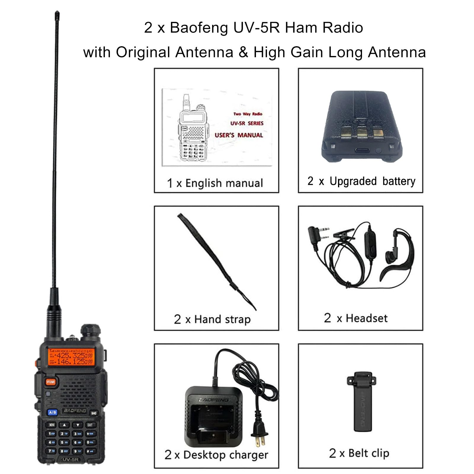 What You Get? 2 x BAOFENG UV-5R radio with original & 14.96inch antennas, 2 x 1800mAh upgraded battery(USB-C Charging), 2 x Headset, 2 x Desktop charger, 2 x Belt clip, 2 x Hand strap, 1 x English manual.