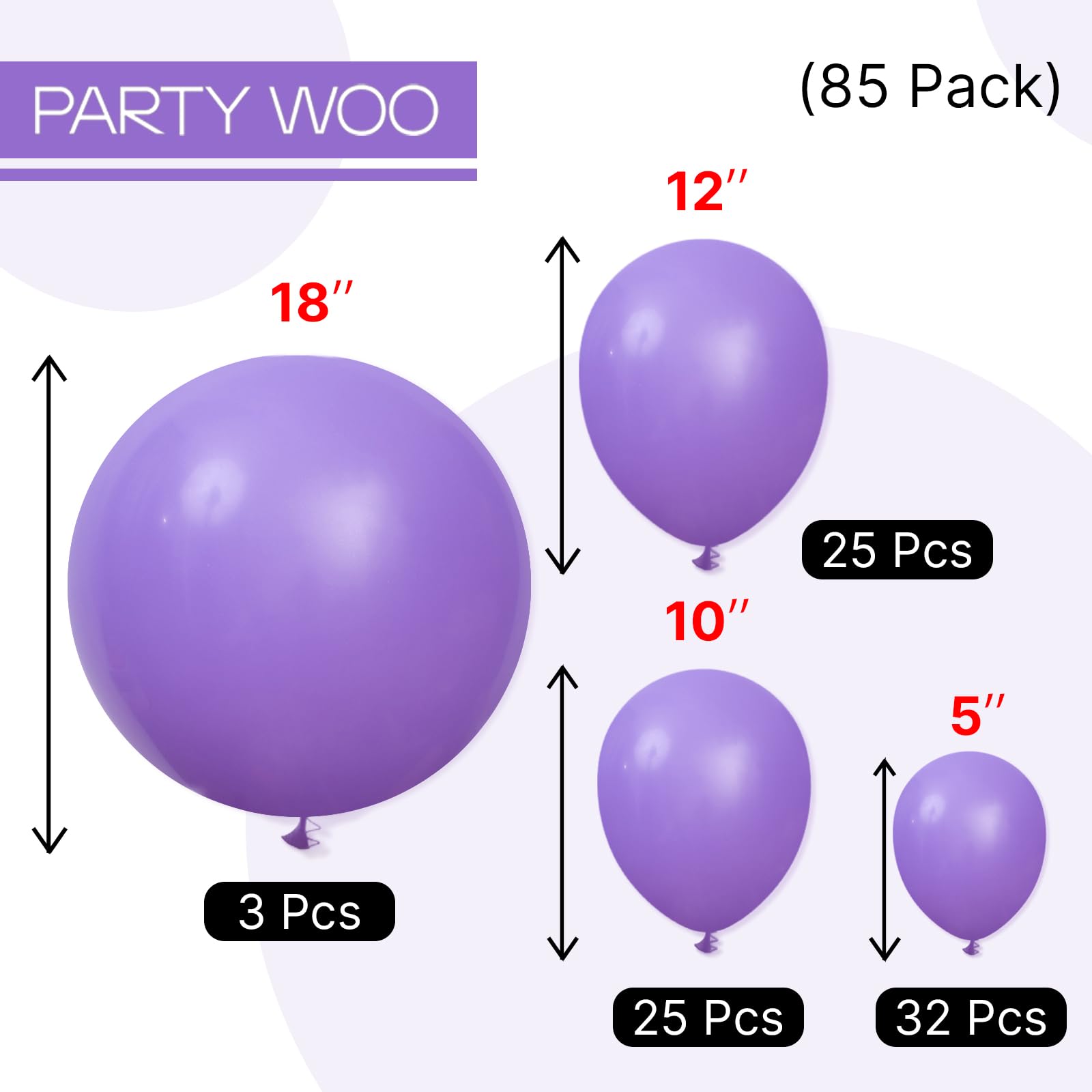 Package includes: 18 inch purple balloons (3 pcs), 12 inch purple balloons (25 pcs), 10 inch purple balloons (25 pcs), 5 inch purple balloons (32 pcs), suitable for parties, pay attentions that 5 inch balloons could NOT float when inflated with HELIUM.