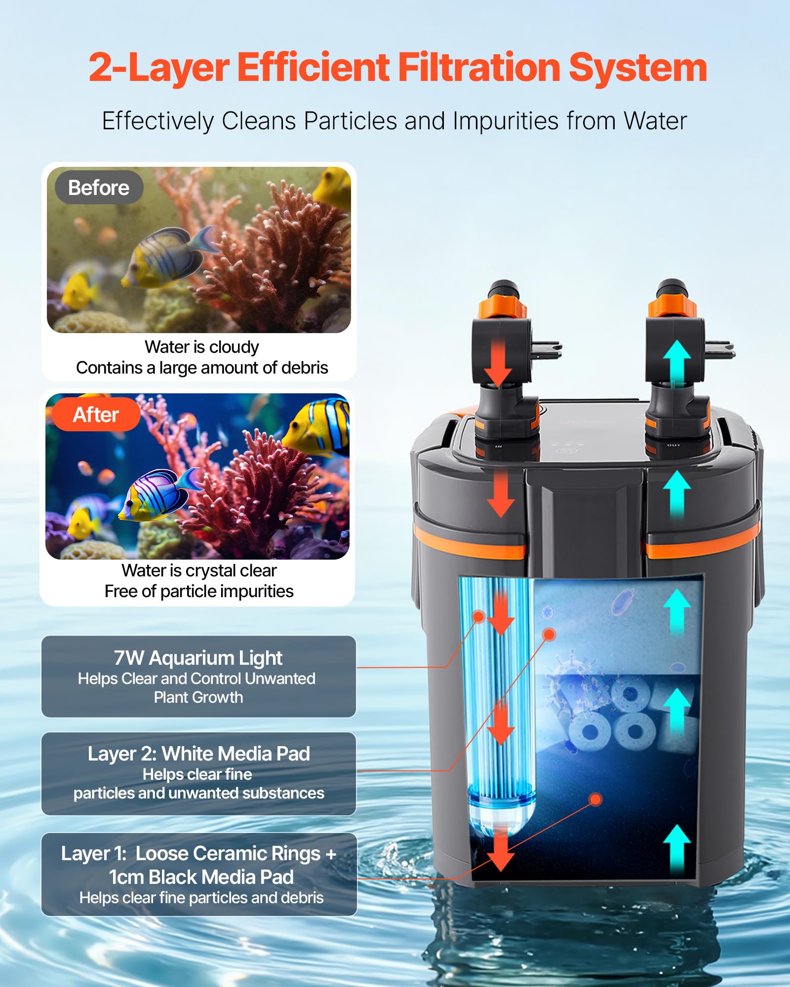 Efficient Filtration: Our aquarium canister filter features a multi-layer filter media, capturing various impurities to ensure clear water quality from coarse to fine layers. With a 7W clean lamp, it cleans weeds under the water and controls their growth